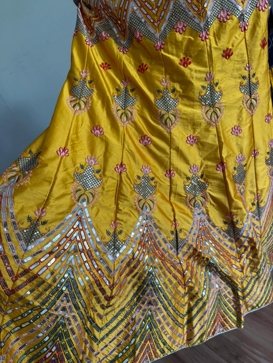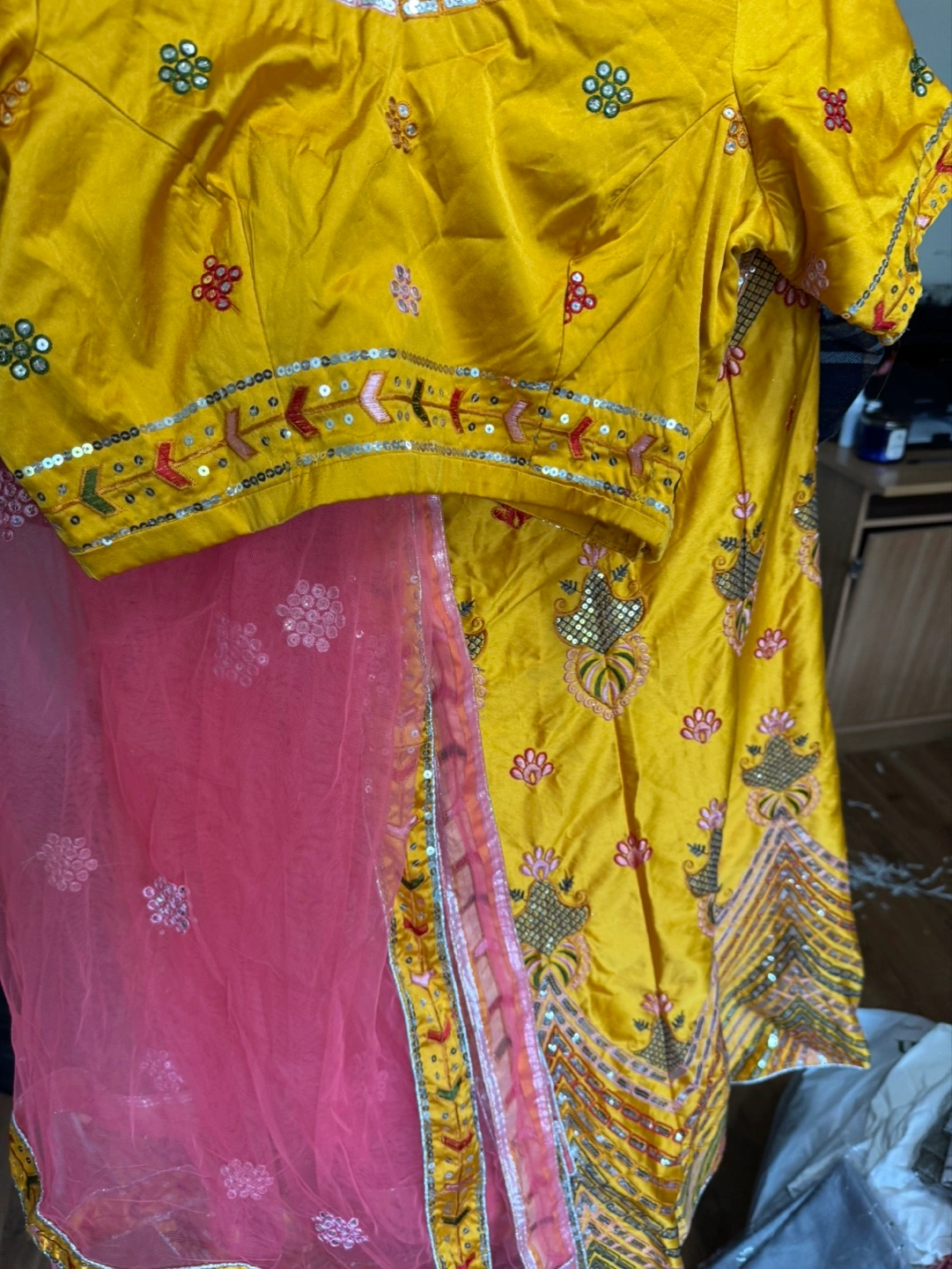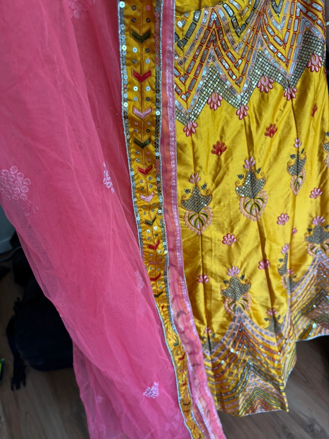 Beautiful yellow lehenga choli, heavily embroidered with sequins and intricate detailing. Matching pink dupatta included. Perfect for special occasions.