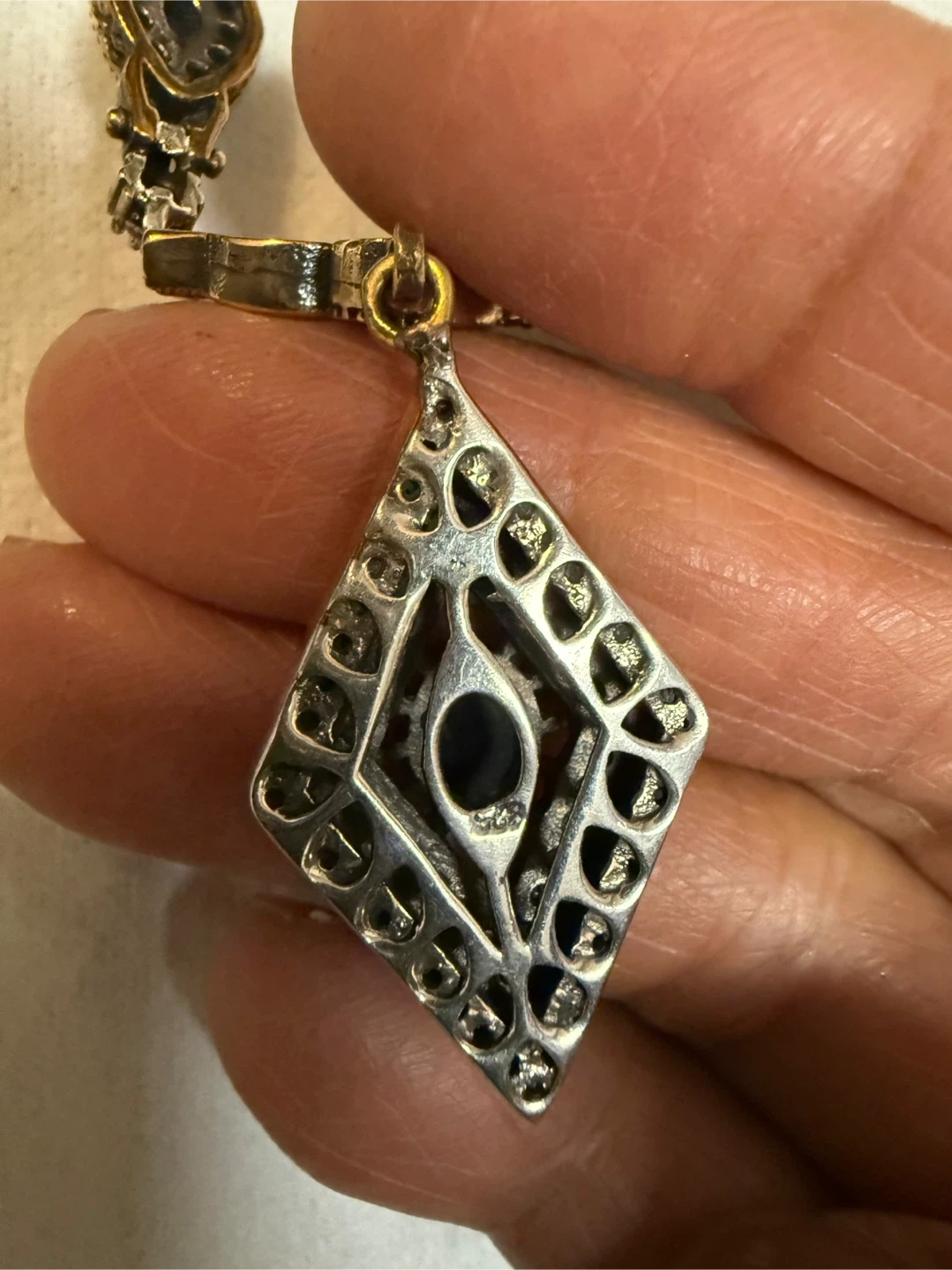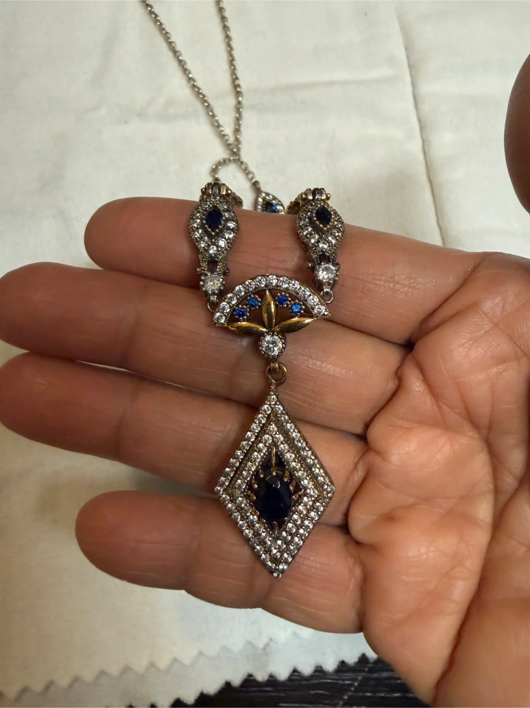 A stunning 18” necklace featuring a 925 sterling silver stamped with copper adorned with oval-shaped blue and clear stones. It has a large diamond-shaped pendant with a dark blue stone at its centre. This piece is perfect for dressing up any outfit!