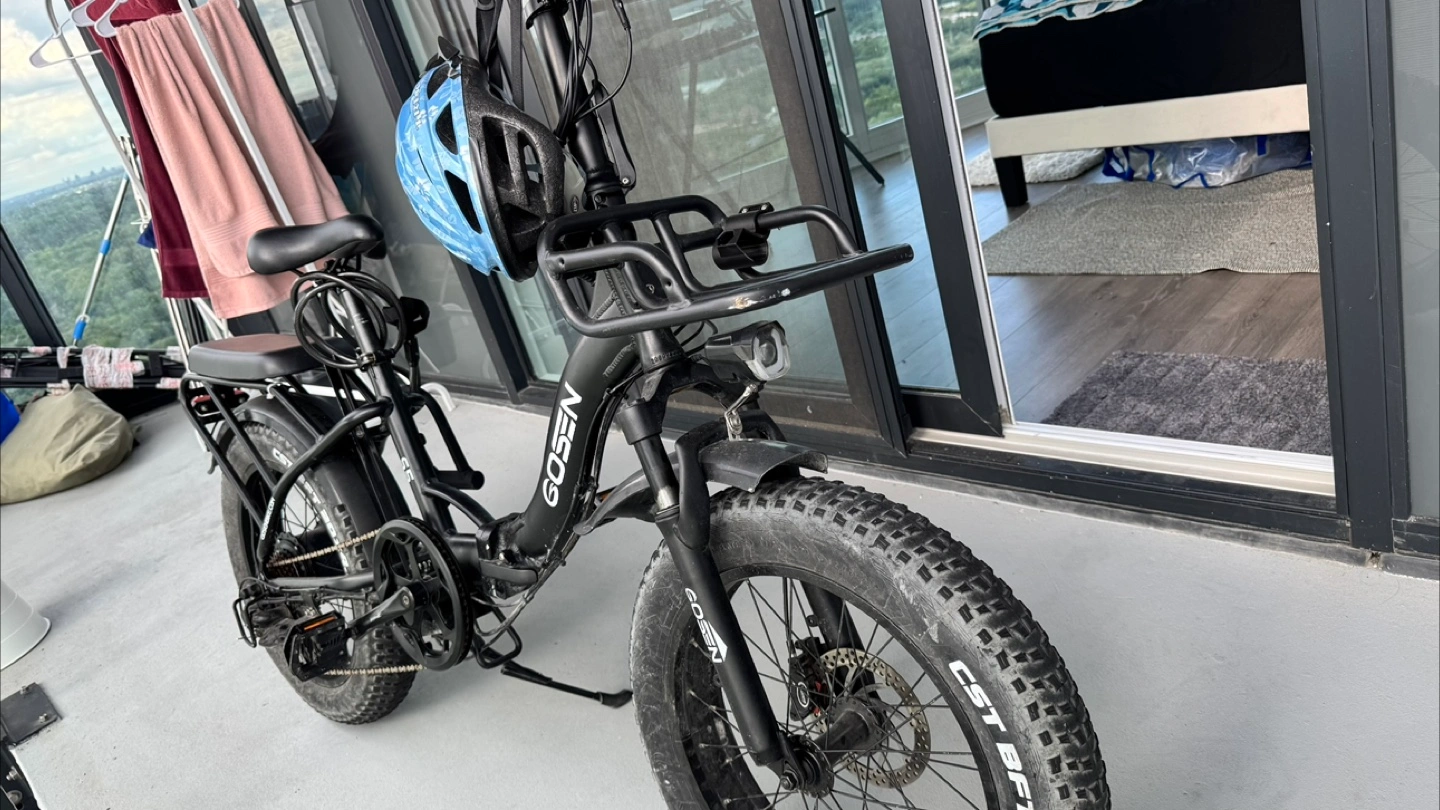 Selling my Gosen folding e-bike, great for commuting, city rides, or delivery work. ✔️ Folding frame – easy to store/transport ✔️ 20x4.0 CST fat tires – smooth & stable ✔️ Front suspension + disc brakes ✔️ Front & rear racks + extended seat ✔️ Fenders, light, mirror ✔️ Includes helmet + strong lock 💲 open to reasonable offers – lightly used, well maintained, ready to ride. 📍 Pickup in Toronto