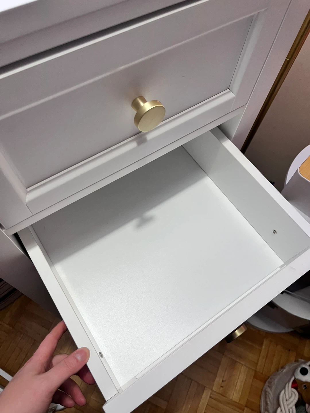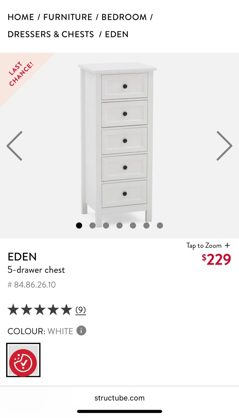 White 5-drawer tall chest of drawers / dresser with gold knobs. This is the Eden chest from Structube, originally came with black knobs *CAN INCLUDE* but I swapped them out for these brushed gold ones.