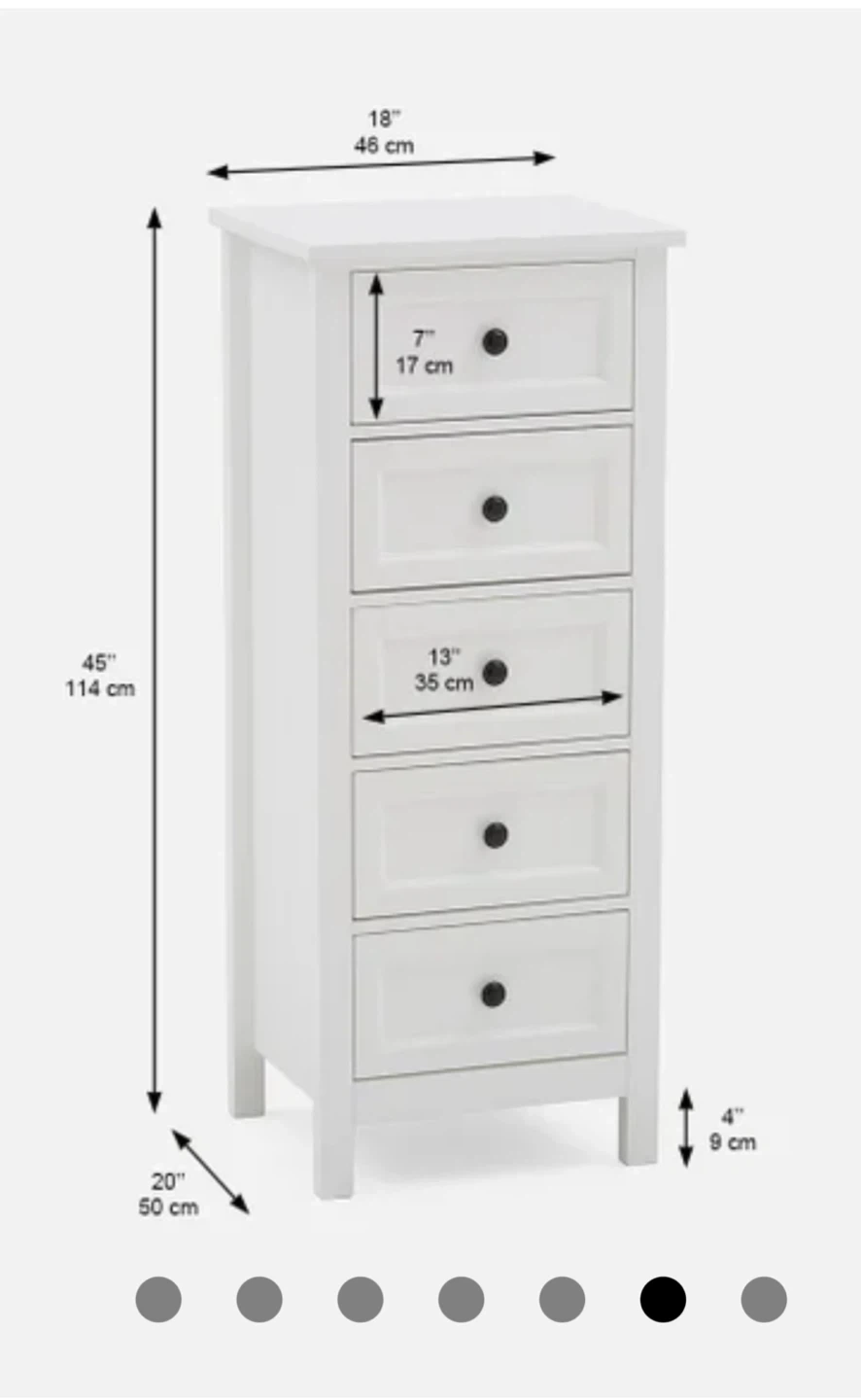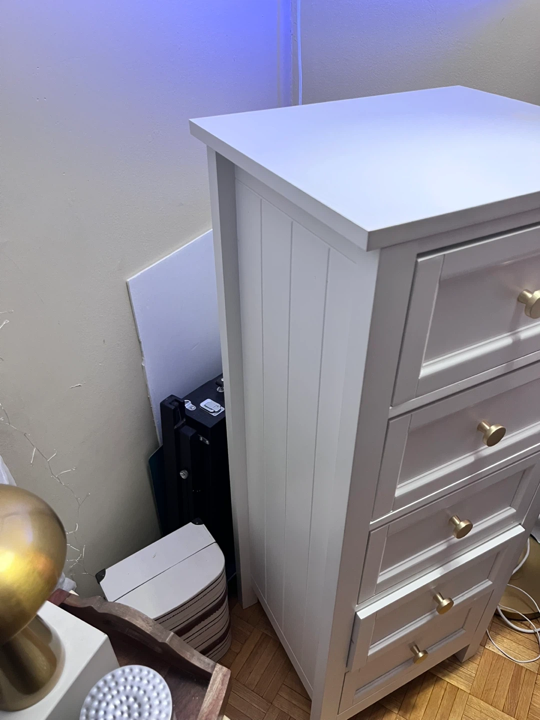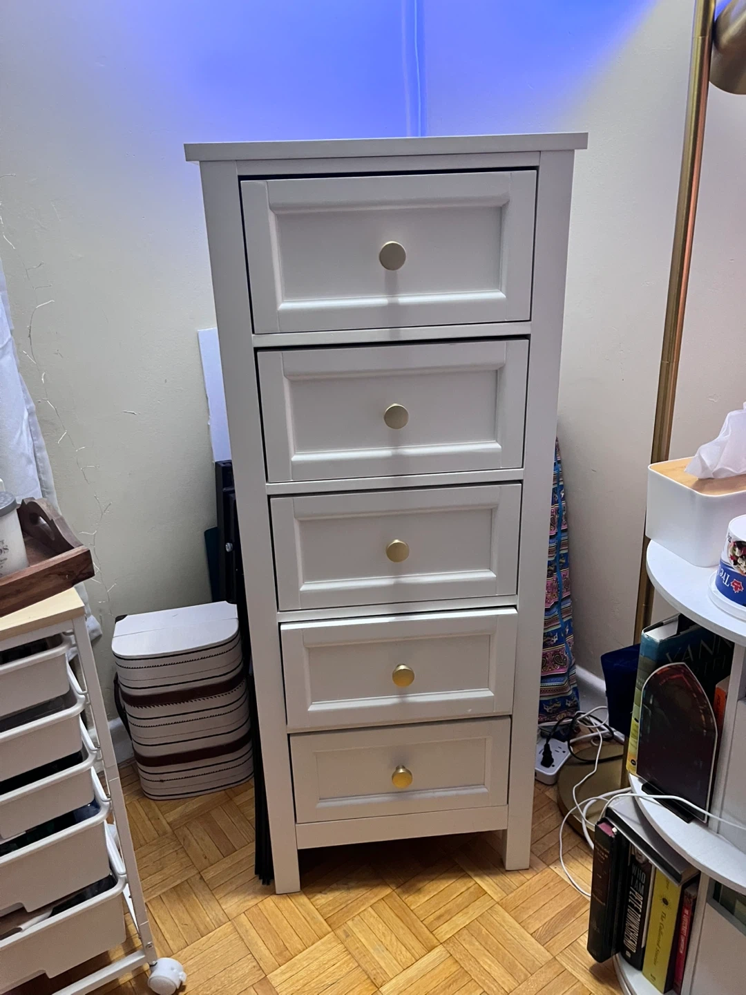 White 5-drawer tall chest of drawers / dresser with gold knobs. This is the Eden chest from Structube, originally came with black knobs *CAN INCLUDE* but I swapped them out for these brushed gold ones.
