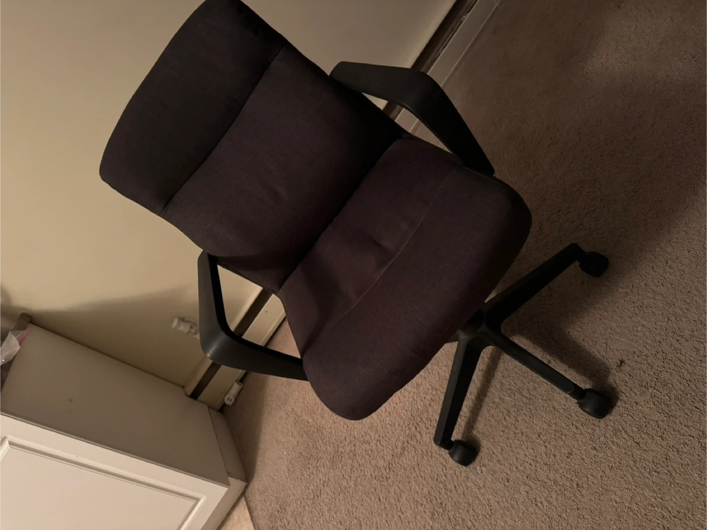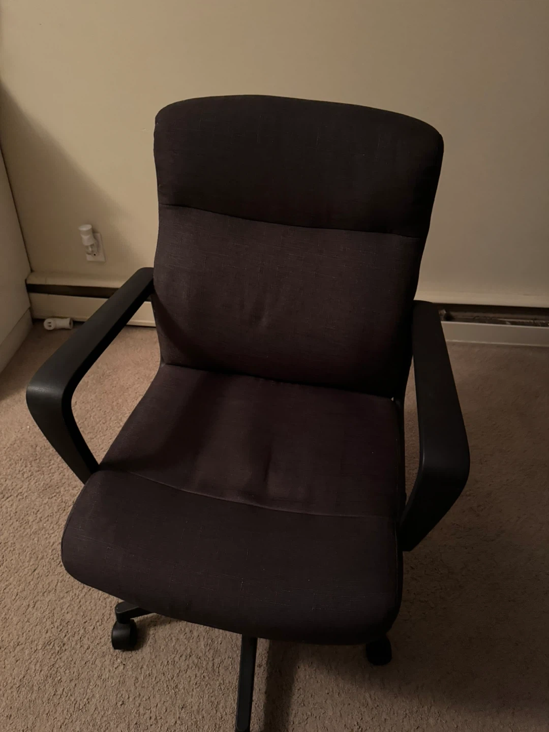 Black fabric office chair with adjustable height and armrests. It features a comfortable padded seat and back. Great for your home office or workspace!
