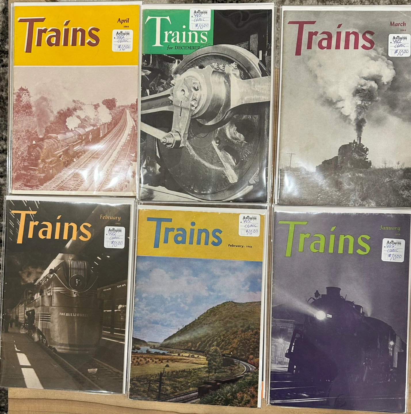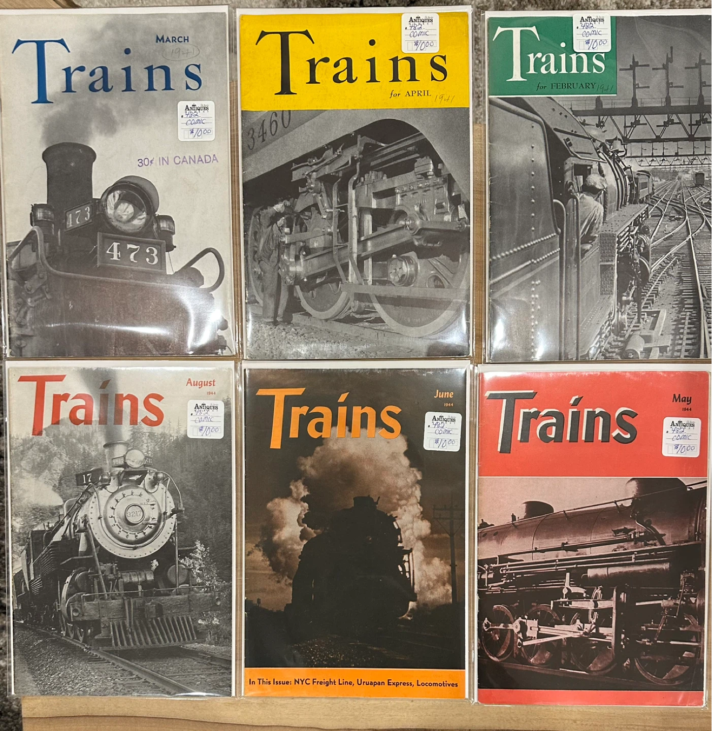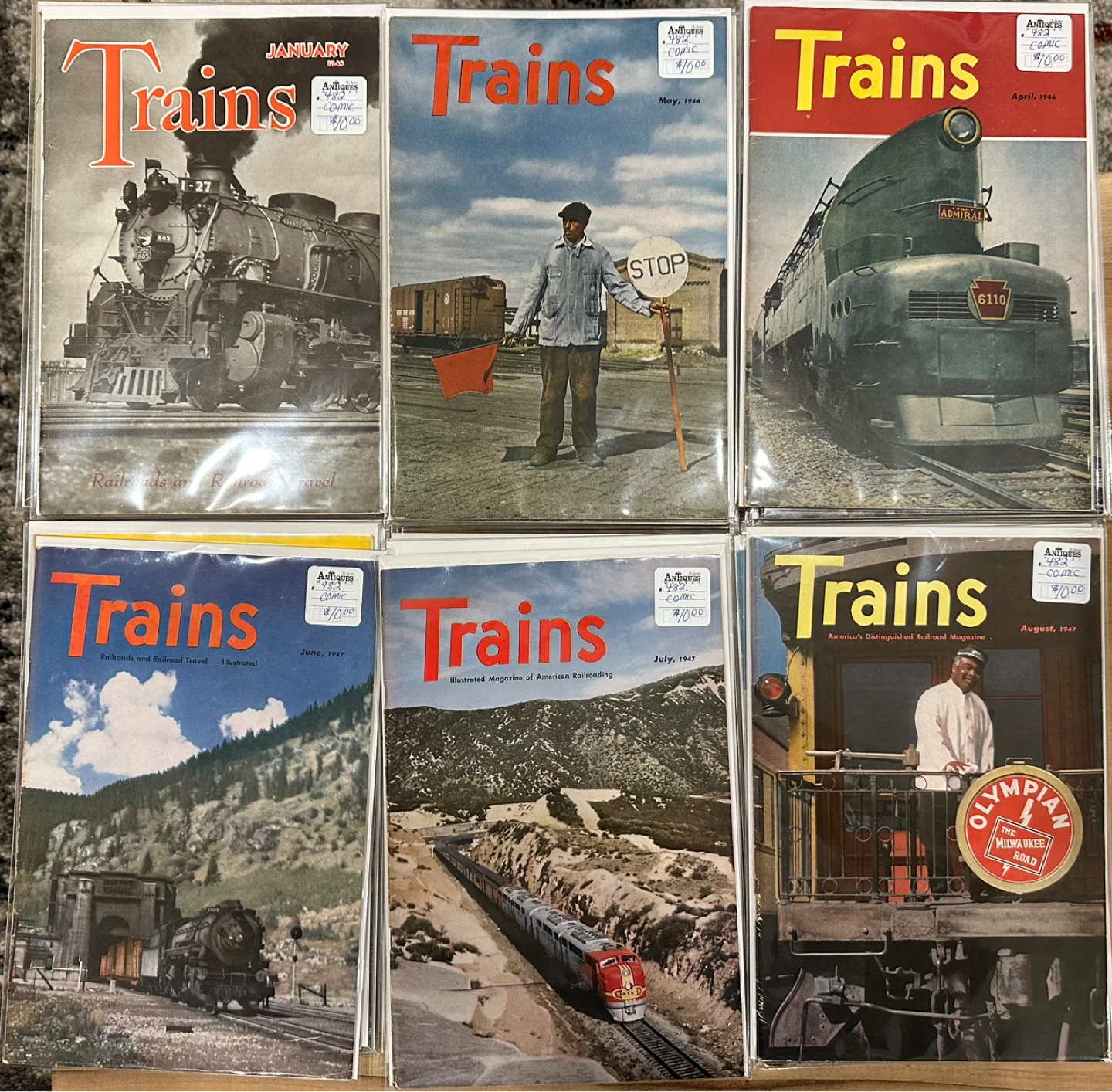 A collection of twelve issues of Trains magazine, featuring articles and photography on American railroading. Issues span from 1944 through 1947. These magazines cover various locomotives and railway operations of the era. These are in GREAT condition for being over 80 years old!! Local Pick-Up or Shipping is available. $10.00 each!