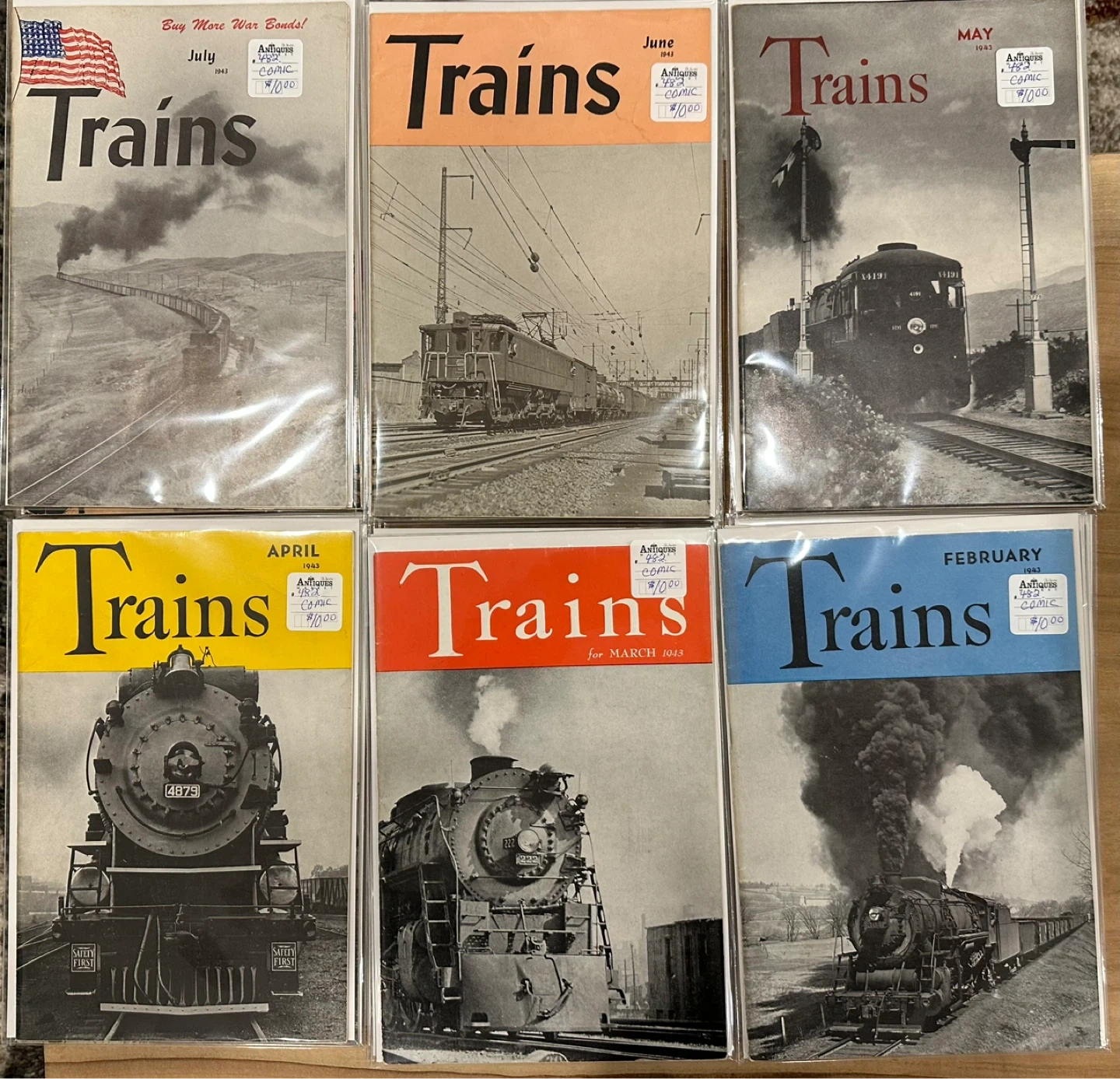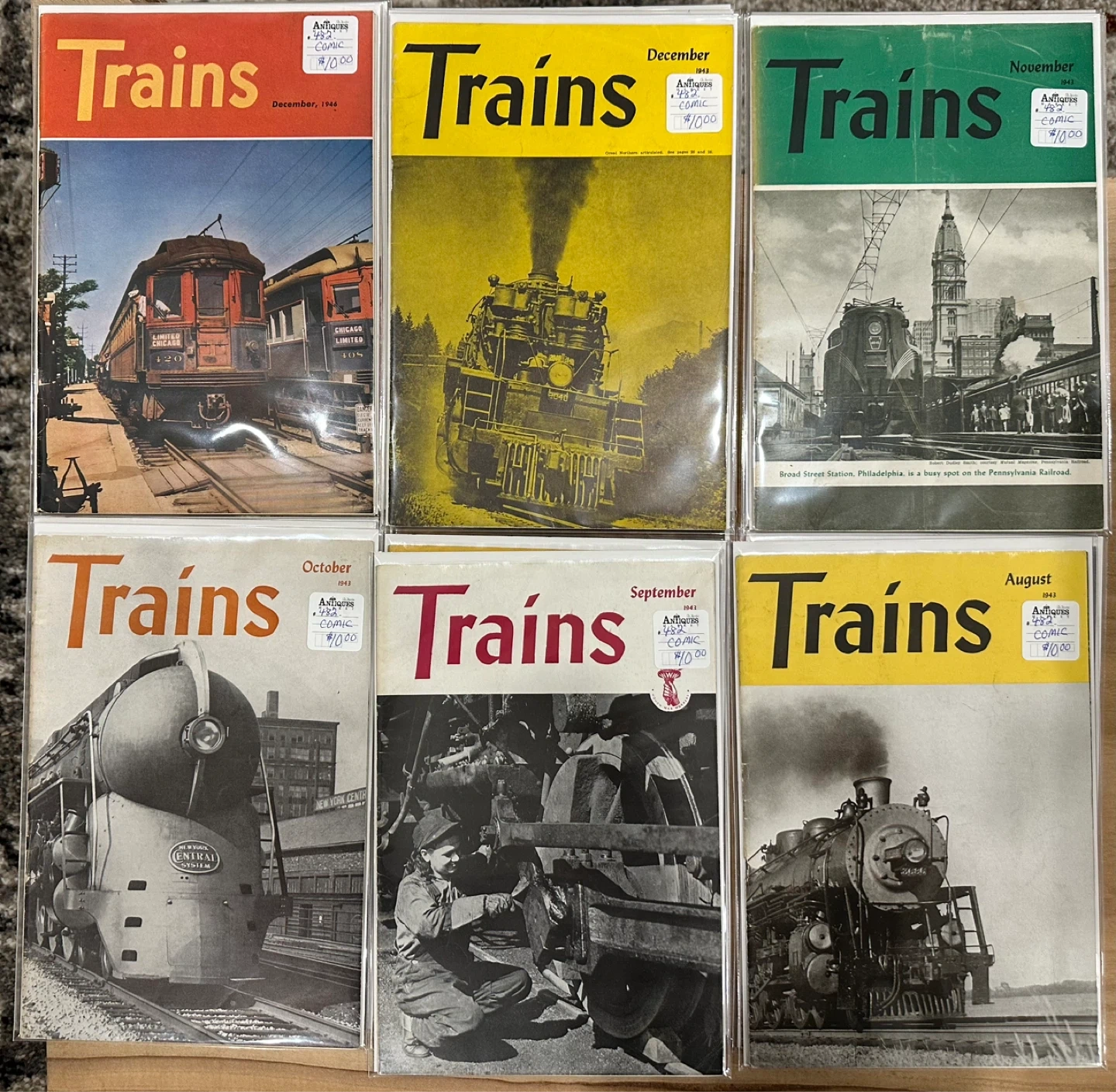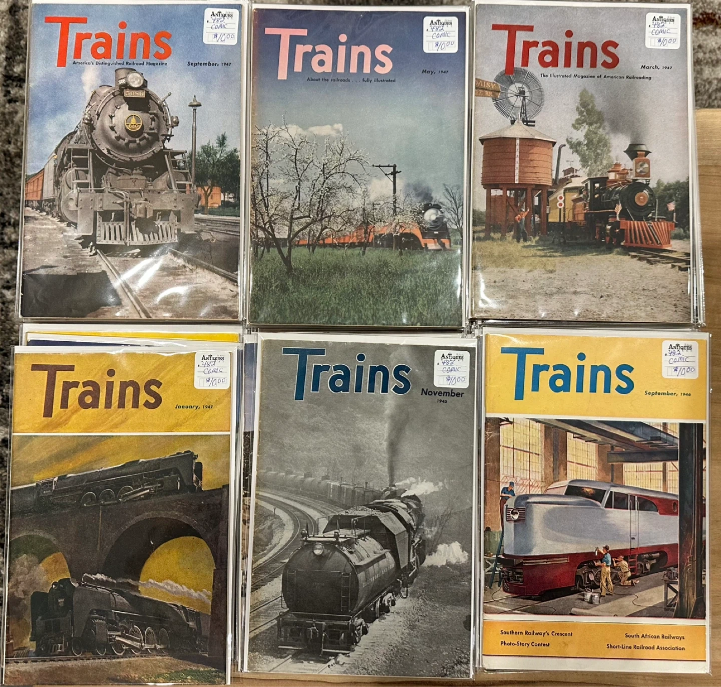 A collection of twelve issues of Trains magazine, featuring articles and photography on American railroading. Issues span from 1944 through 1947. These magazines cover various locomotives and railway operations of the era. These are in GREAT condition for being over 80 years old!! Local Pick-Up or Shipping is available. $10.00 each!
