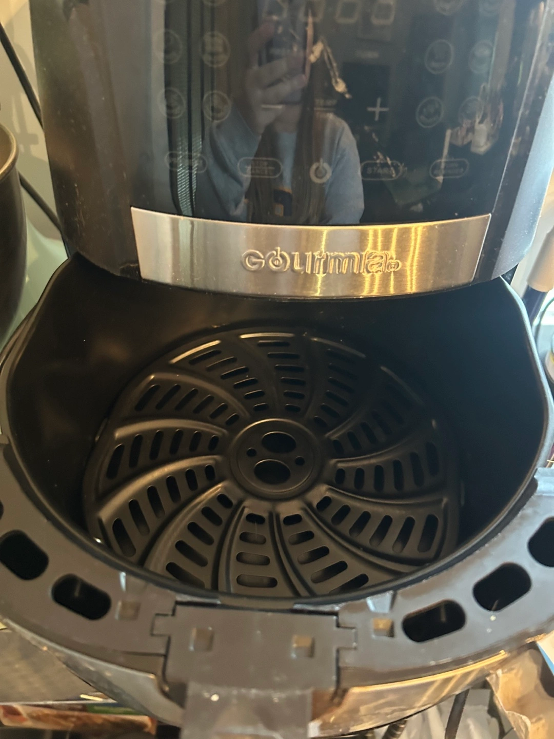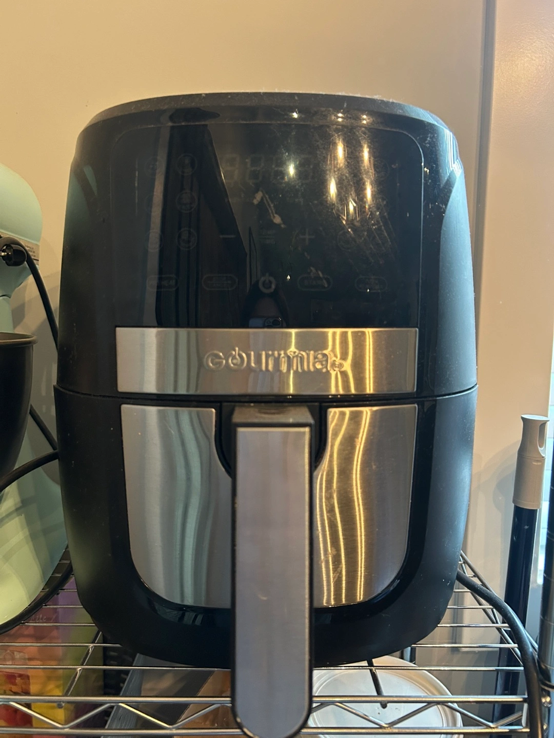 Barely used Gourmia brand air fryer. Black exterior, silver handle. Has a digital display panel.