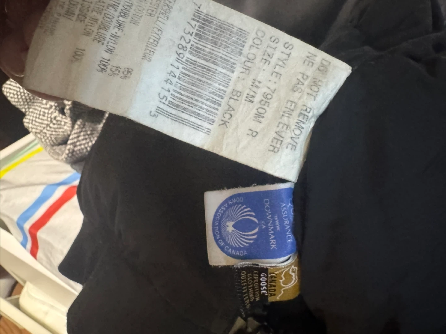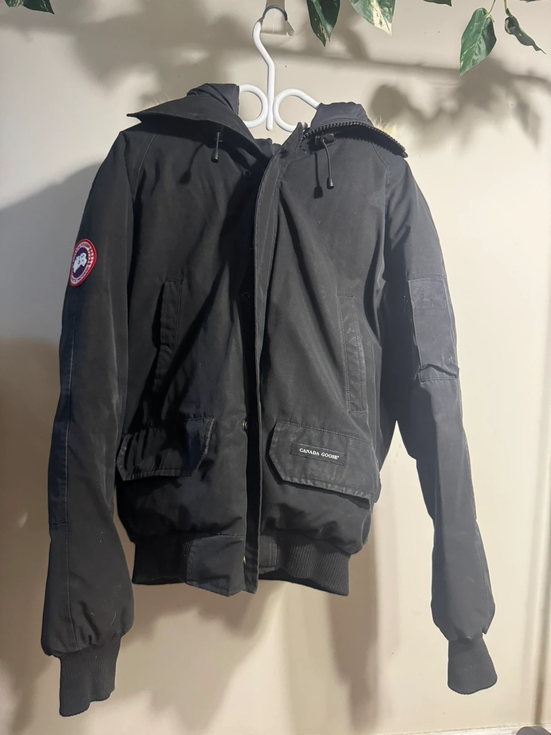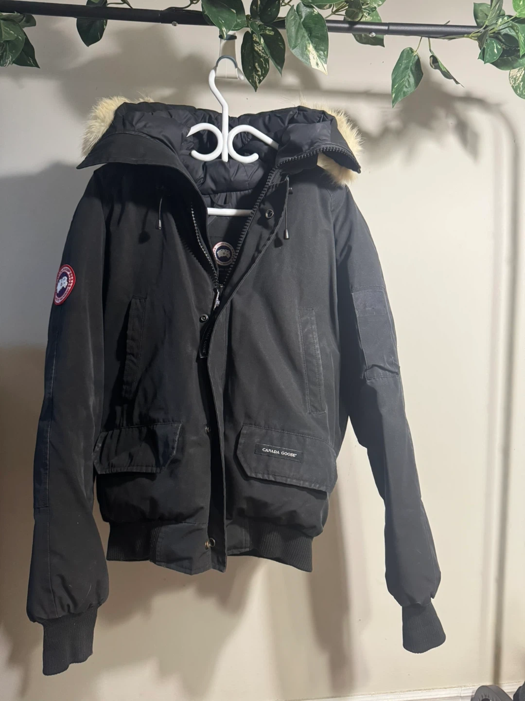 Canada Goose bomber jacket in black. Style 7950M R. Made in Canada. Features a hood with fur trim and multiple pockets.