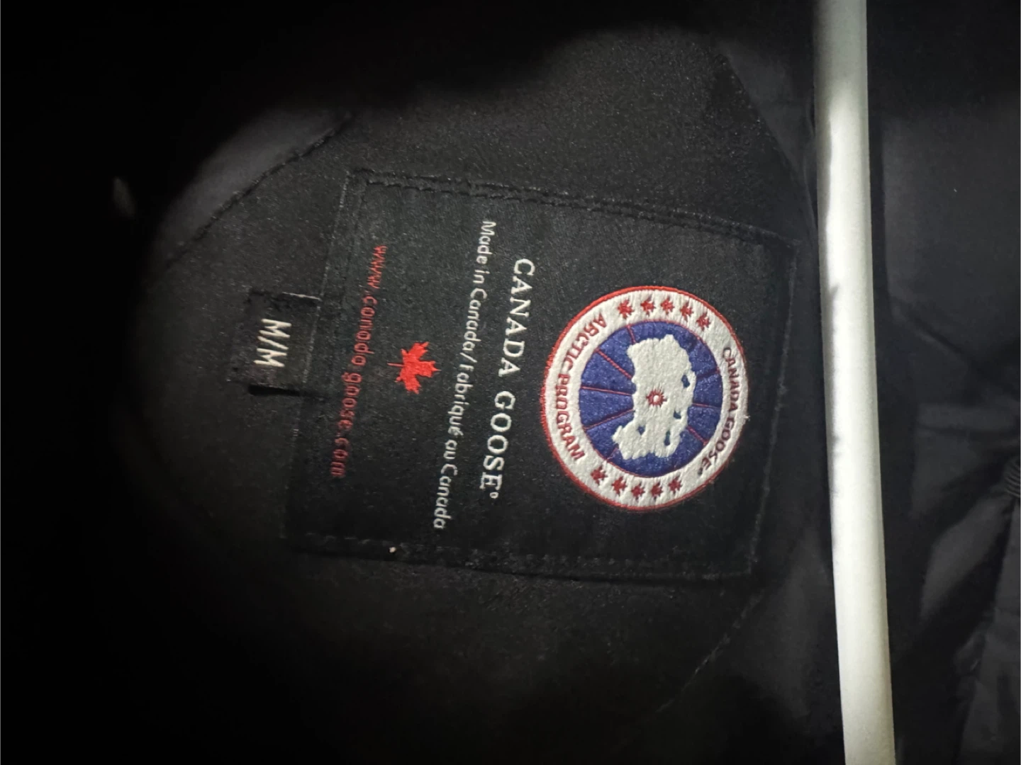 Canada Goose bomber jacket in black. Style 7950M R. Made in Canada. Features a hood with fur trim and multiple pockets.
