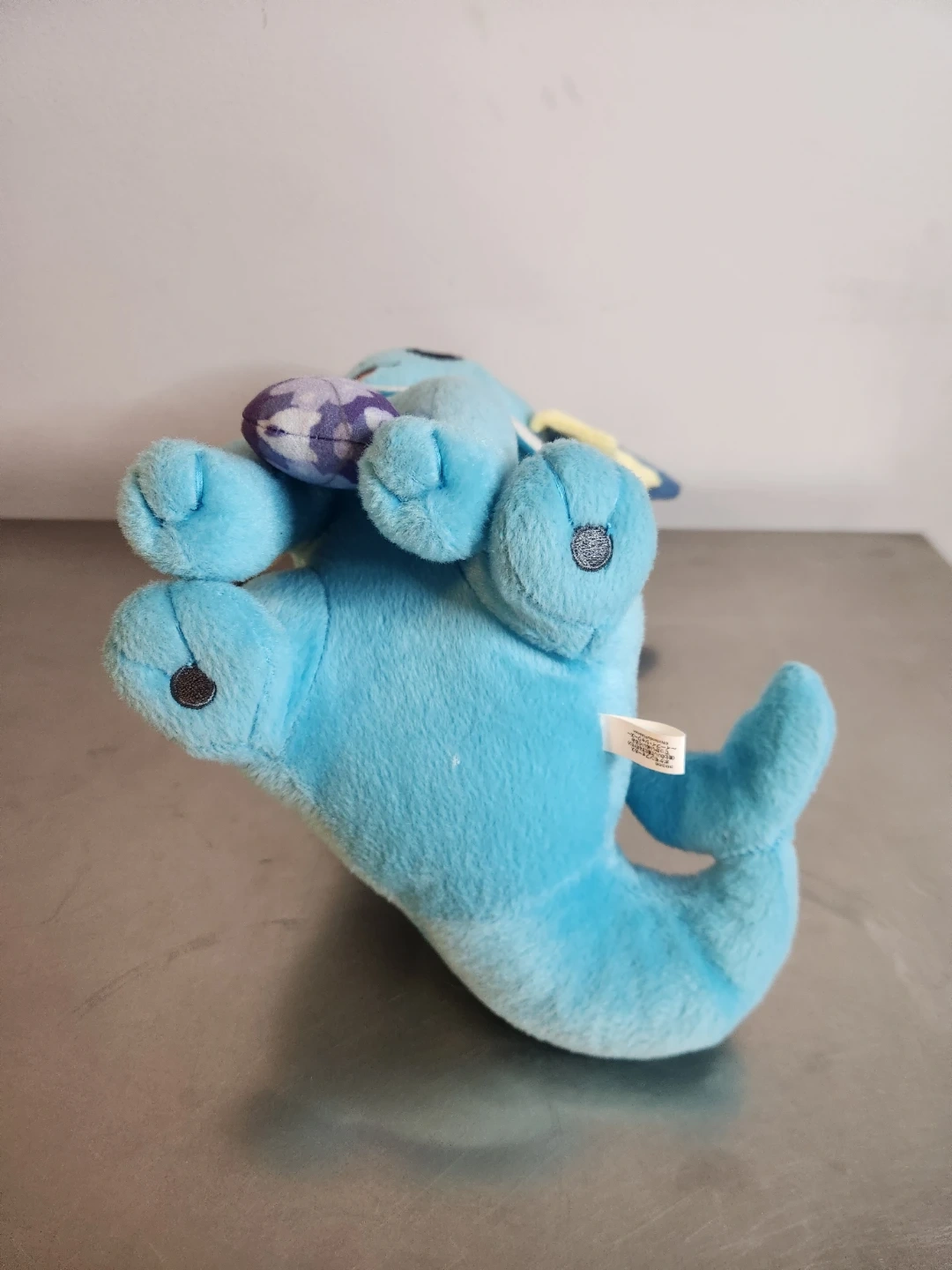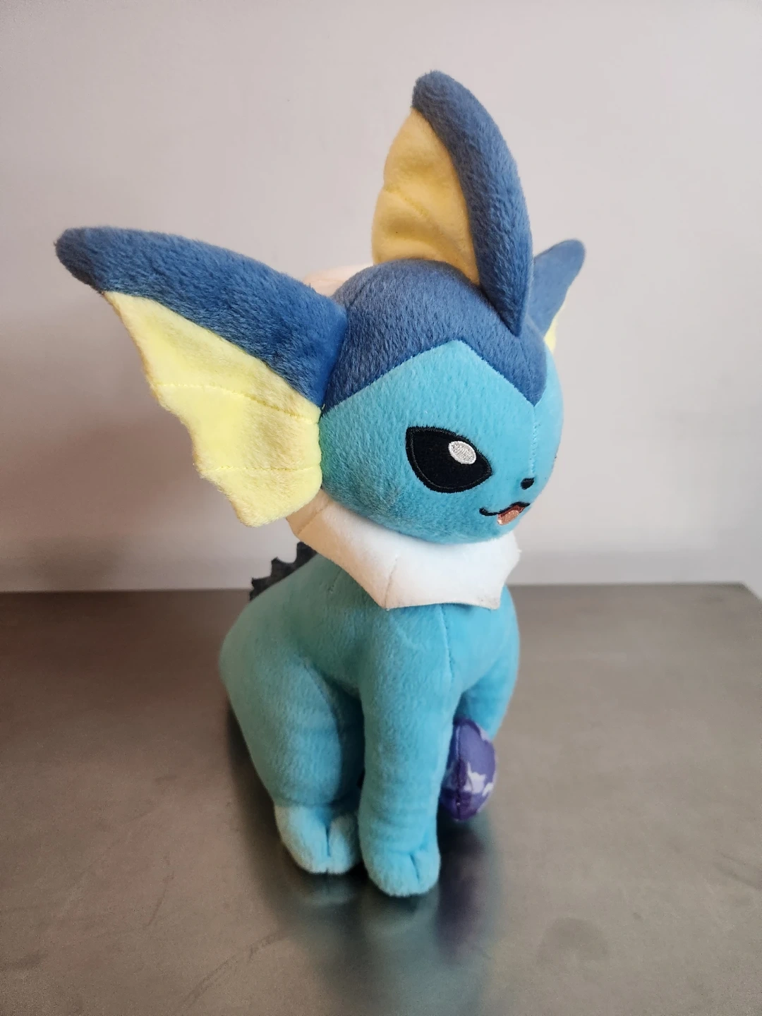 A cute Vaporeon plush toy. It's a soft, blue plush with yellow accents on its ears and fins. This plush is holding a purple, patterned ball. It's a great collectible for any Pokémon fan!