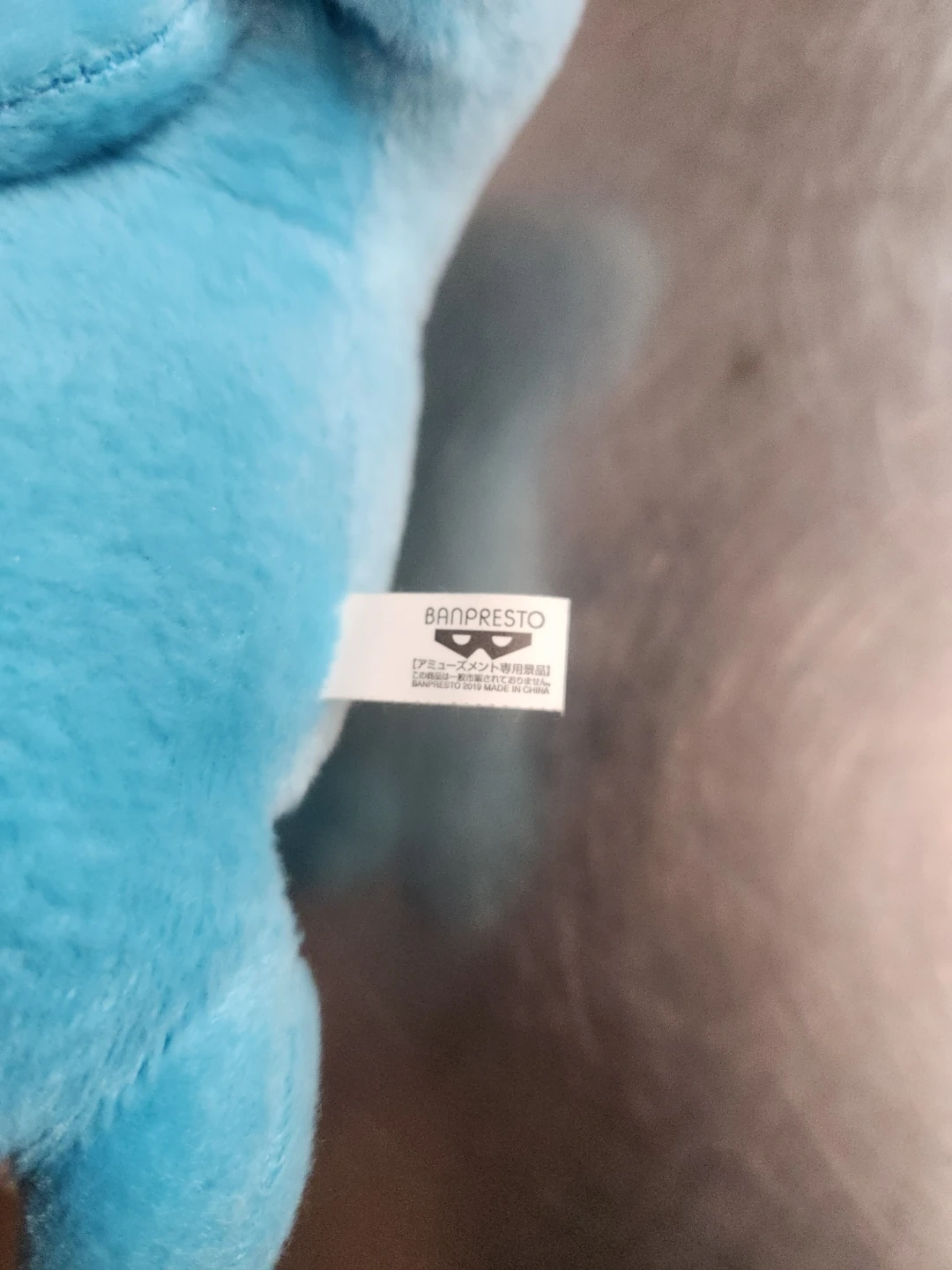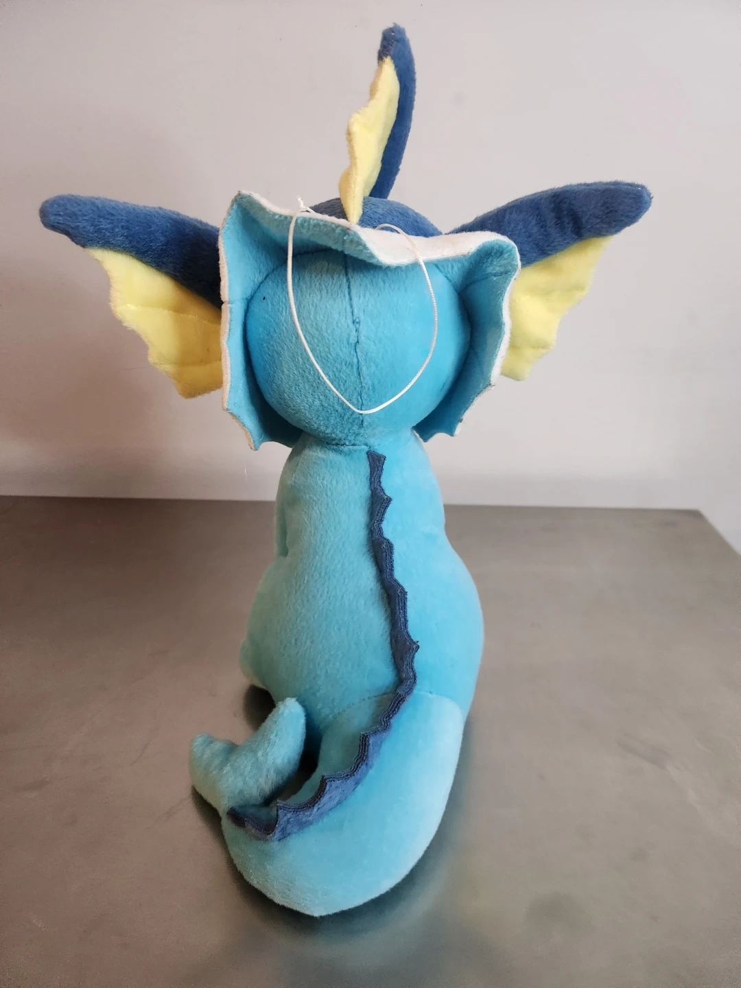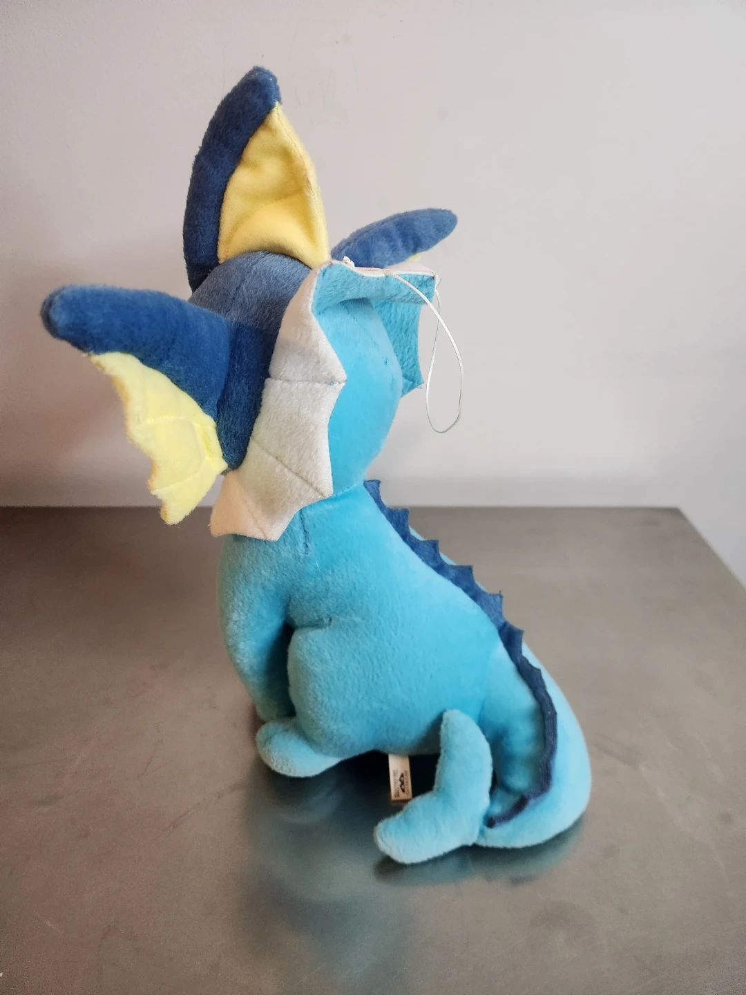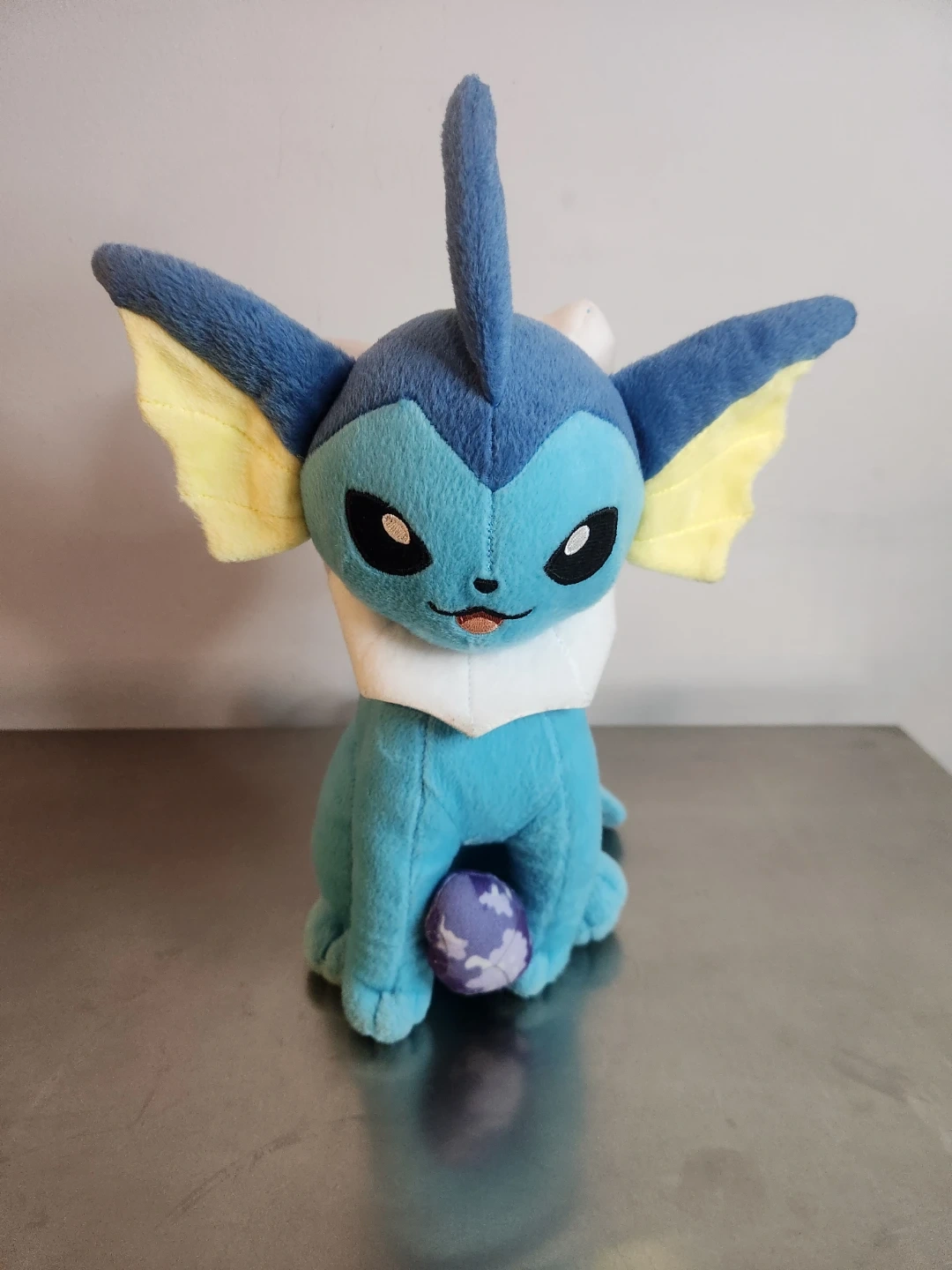 A cute Vaporeon plush toy. It's a soft, blue plush with yellow accents on its ears and fins. This plush is holding a purple, patterned ball. It's a great collectible for any Pokémon fan!