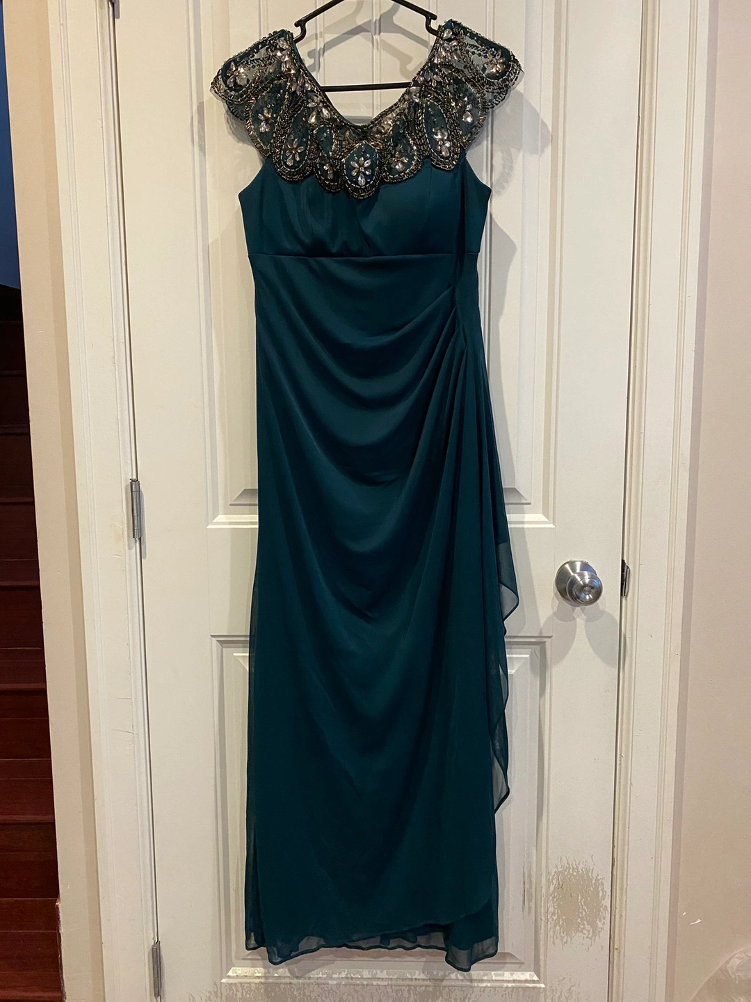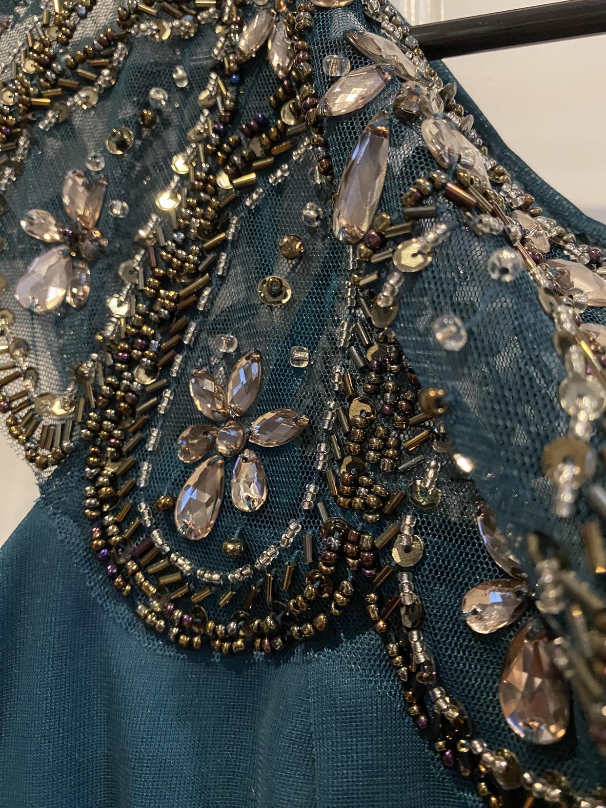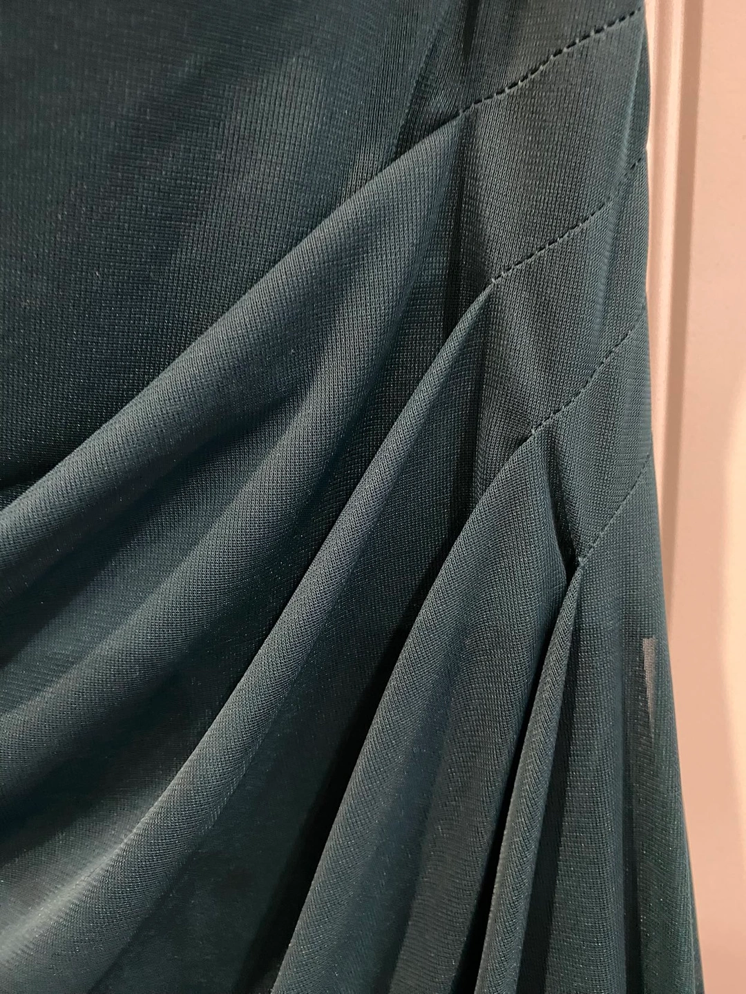 Worn once at a wedding reception. Excellent condition bead works intact. Pleats on left side. Ruching at the back accentuate the behind.