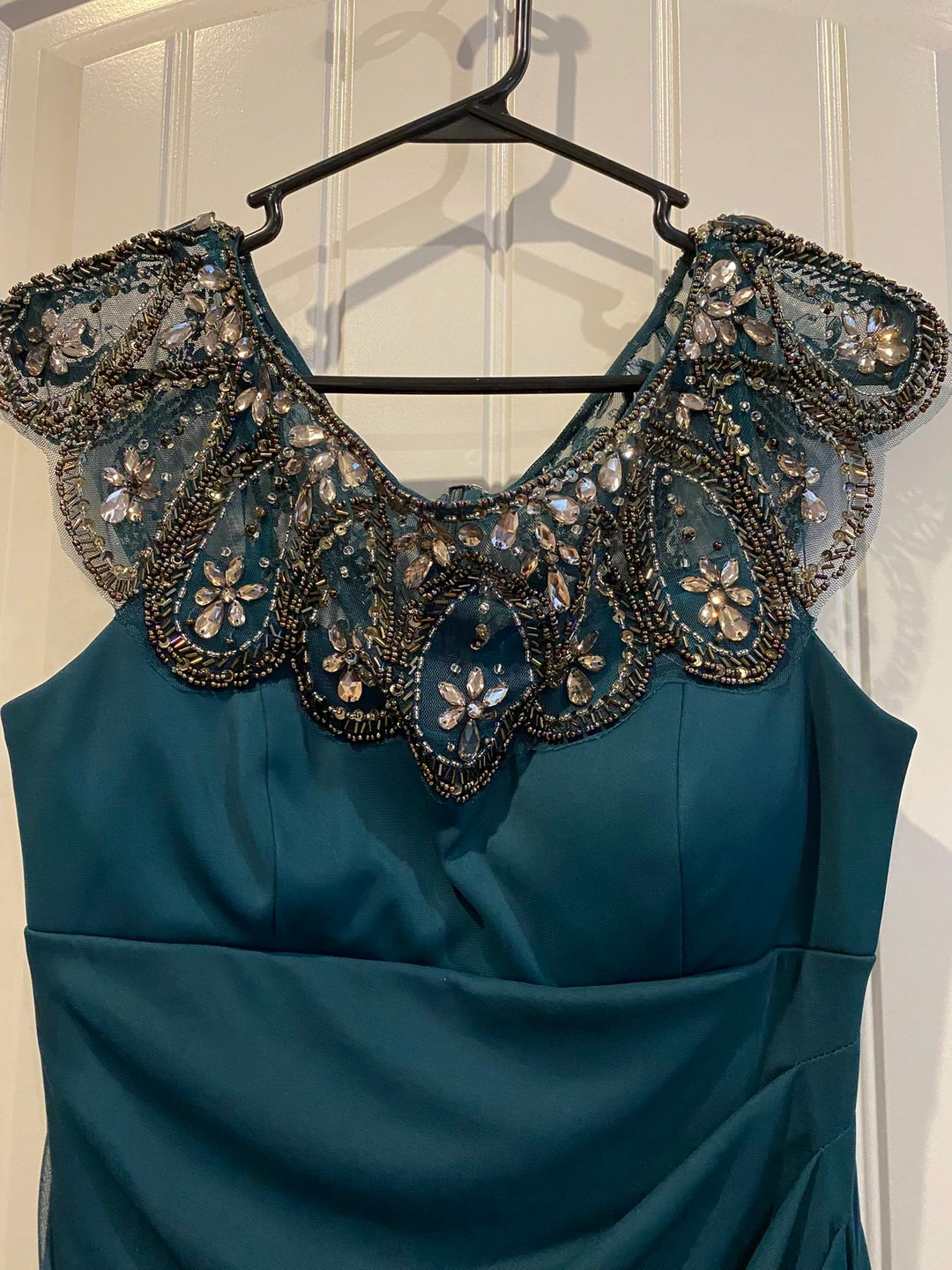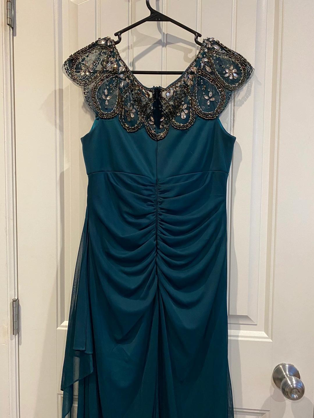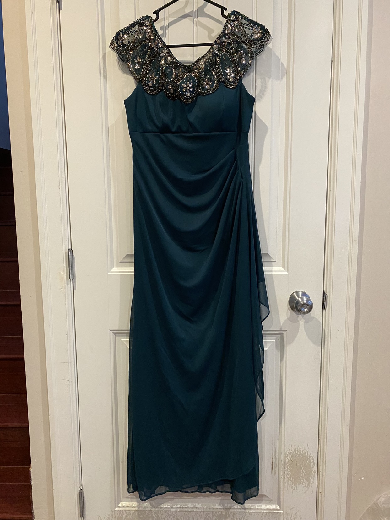 Worn once at a wedding reception. Excellent condition bead works intact. Pleats on left side. Ruching at the back accentuate the behind.