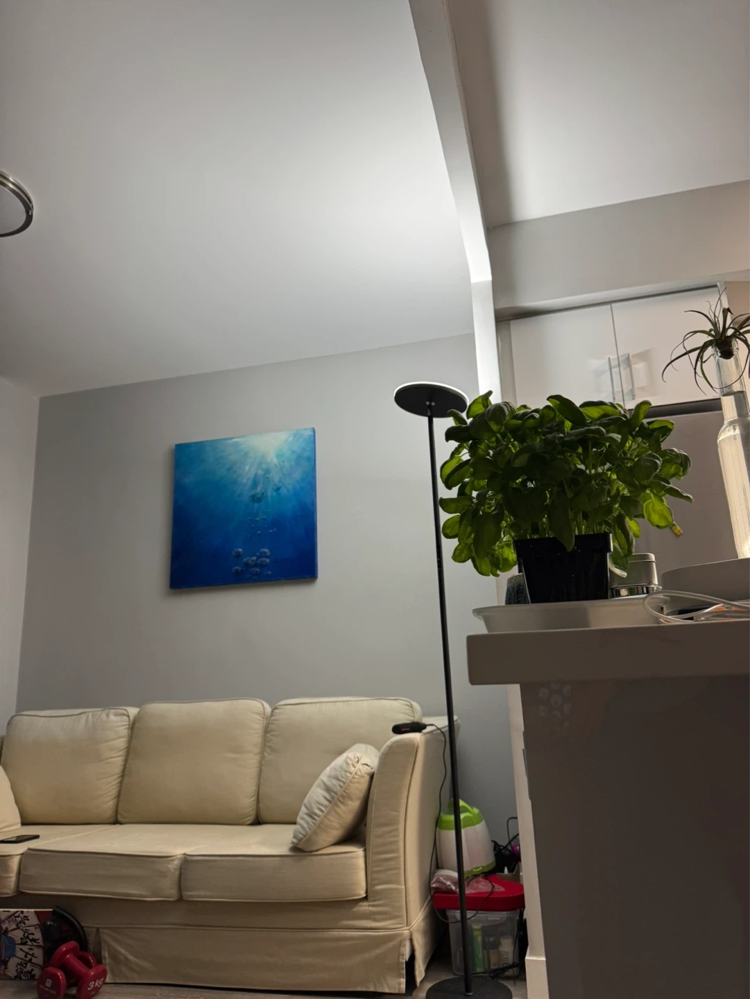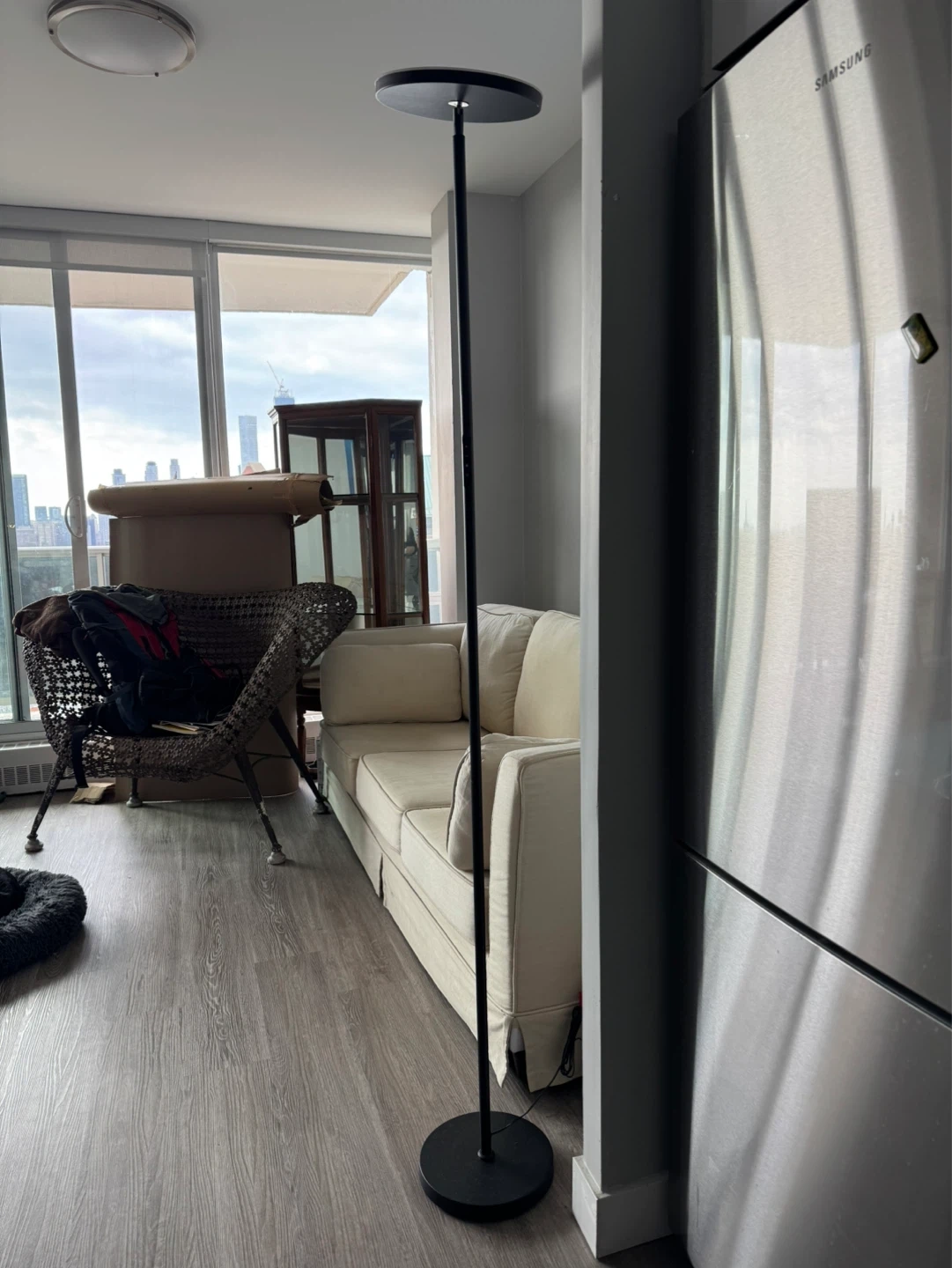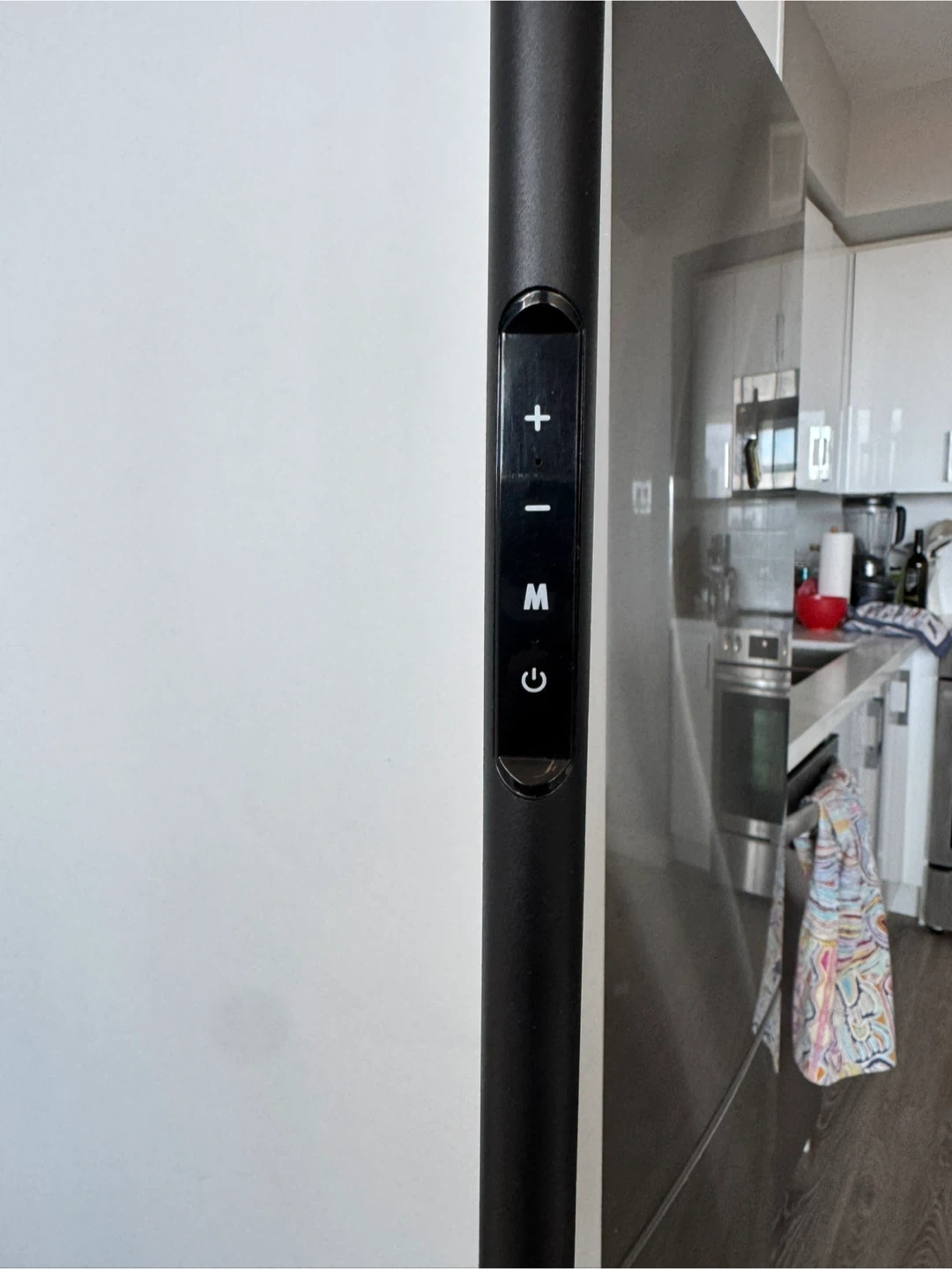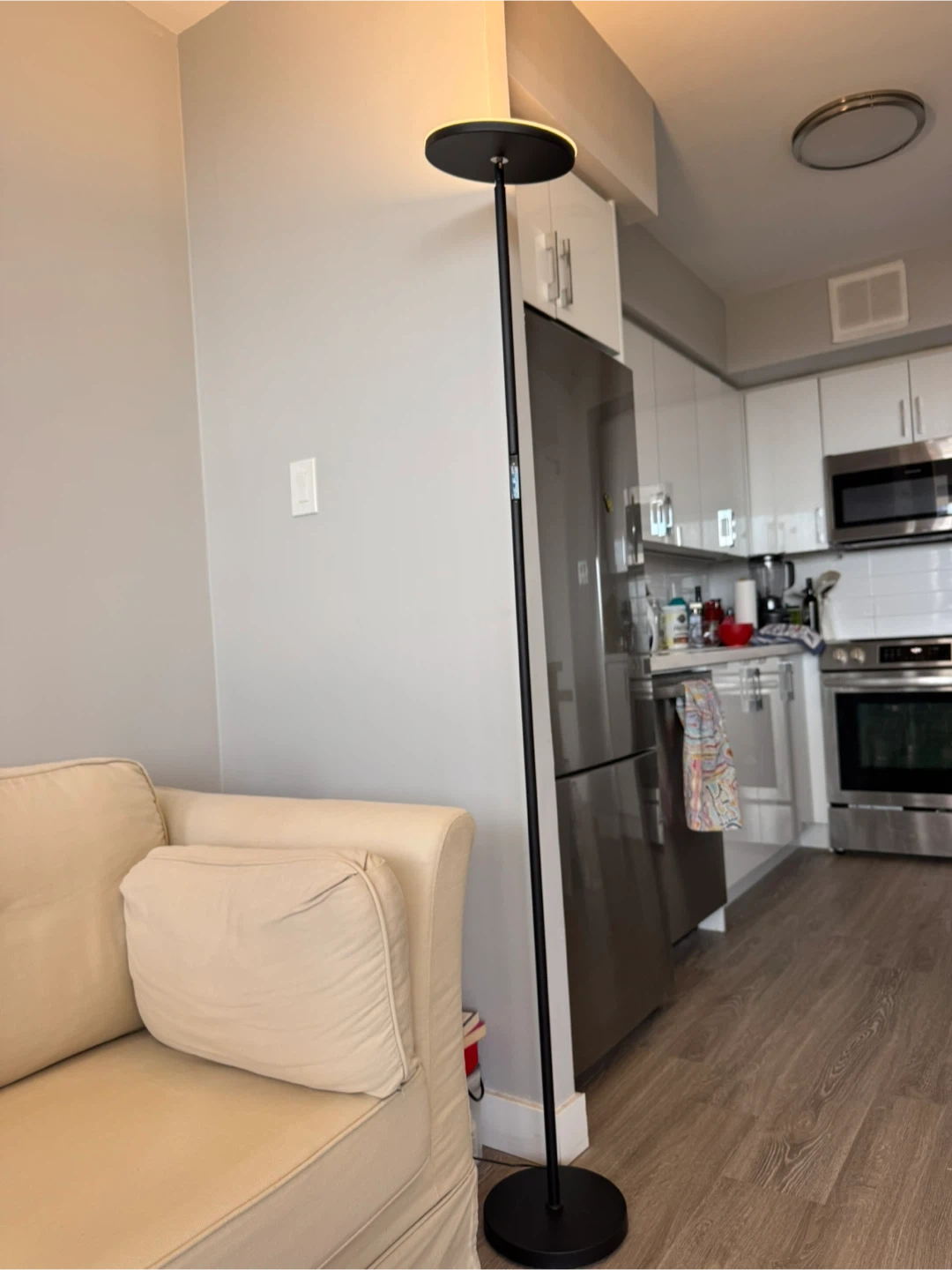 Sleek black floor lamp with a circular frosted shade. It features integrated touch controls for power, brightness adjustment, and mode selection. Provides adjustable ambient lighting for any room. Upward angle minimises glare.
