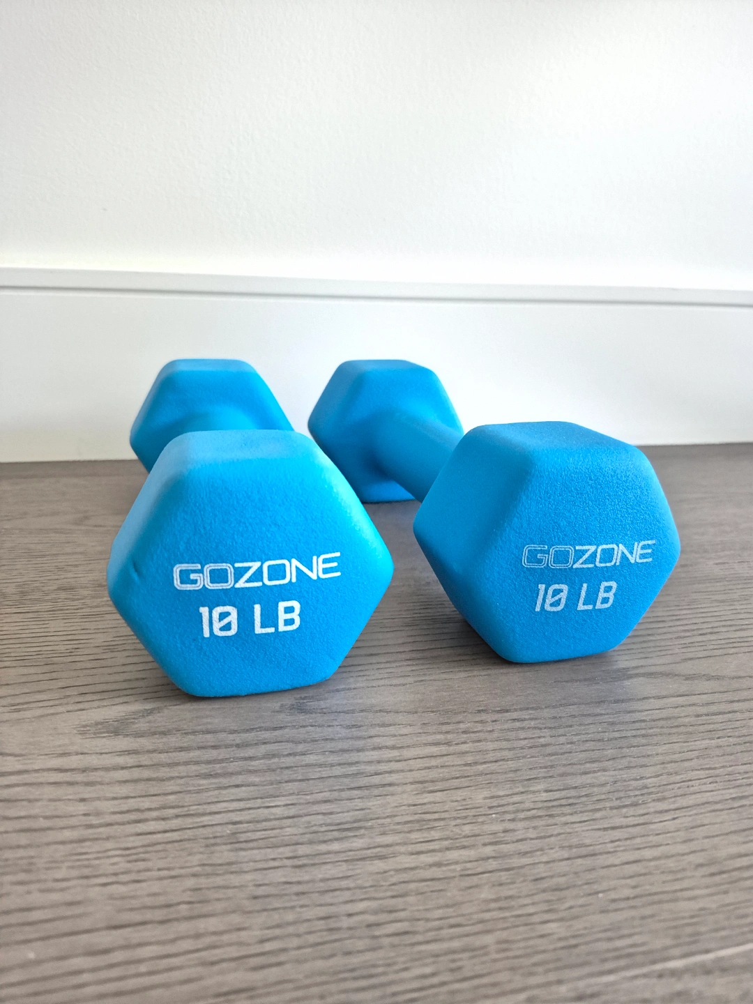 68- Lightly used (only 5 times) and thoroughly wiped clean - Set of two 10lb weights – great for home workouts, strength training, or rehab - Durable neoprene coating for long-lasting use - Soft, non-slip grip for added comfort and control - No-roll hexagonal ends keep weights in place - Precision-balanced for even weight distribution *from a smoke-free/pet-free home