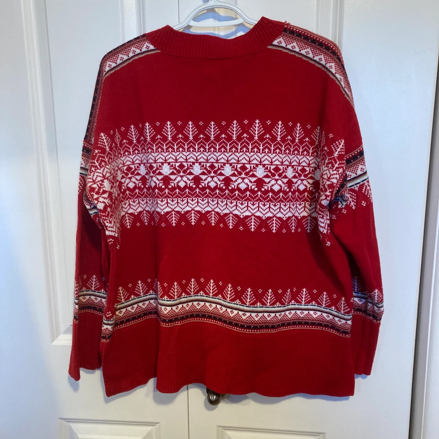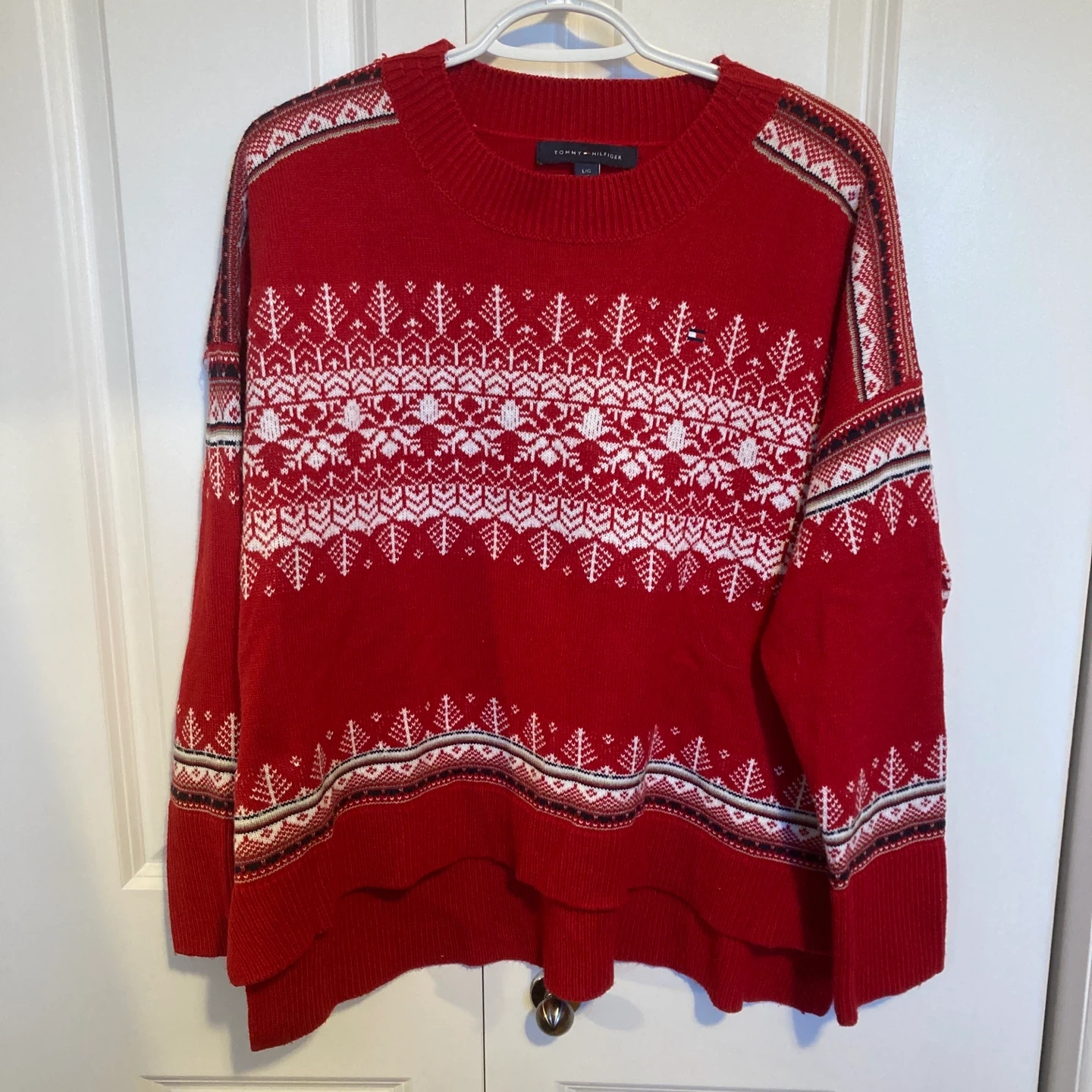 A festive red Tommy Hilfiger knit sweater featuring a white fair isle and tree pattern. It's size large. This sweater is great for holiday gatherings!
