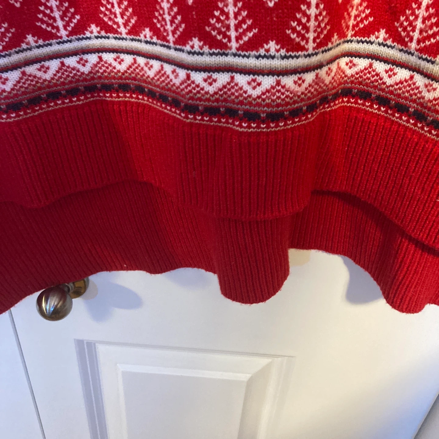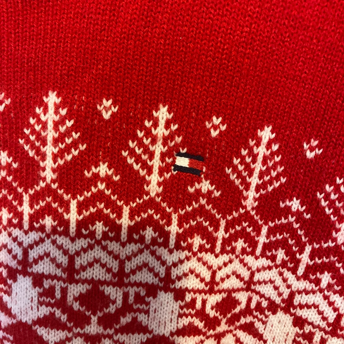 A festive red Tommy Hilfiger knit sweater featuring a white fair isle and tree pattern. It's size large. This sweater is great for holiday gatherings!