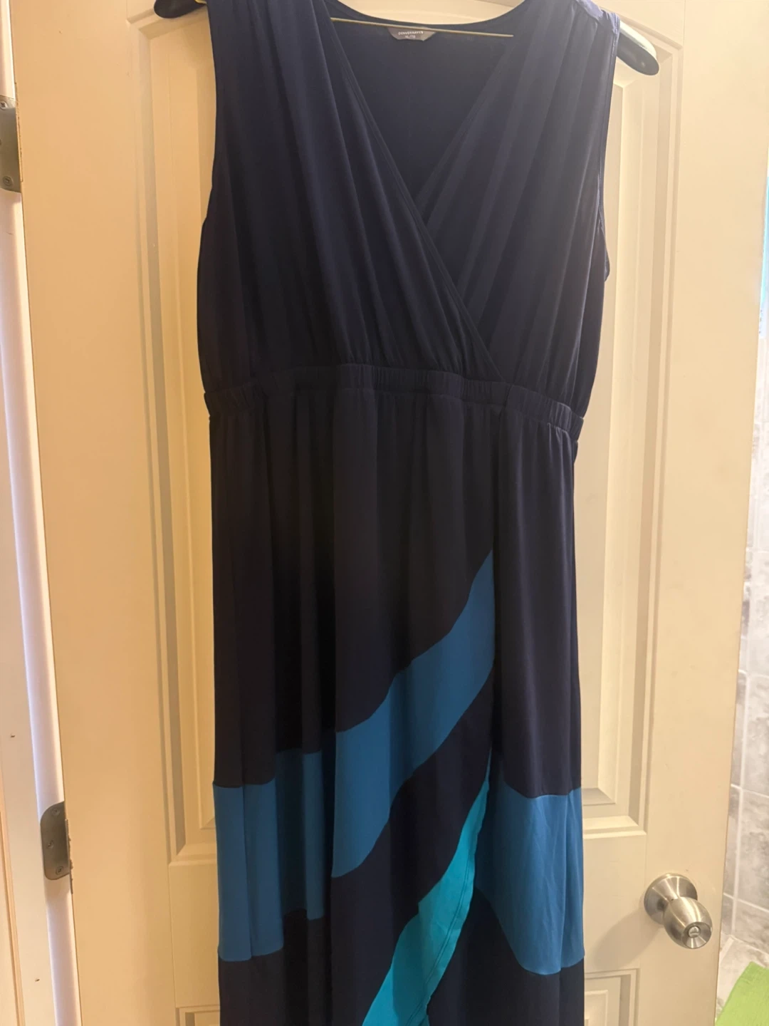 Sleeveless navy blue maxi dress with a flattering wrap-style bodice. It features a cinched elastic waistband and diagonal teal and blue stripe accents on the skirt. This dress is made from a soft, stretchy fabric. Size XL pick it up and enjoy it for free ☺️