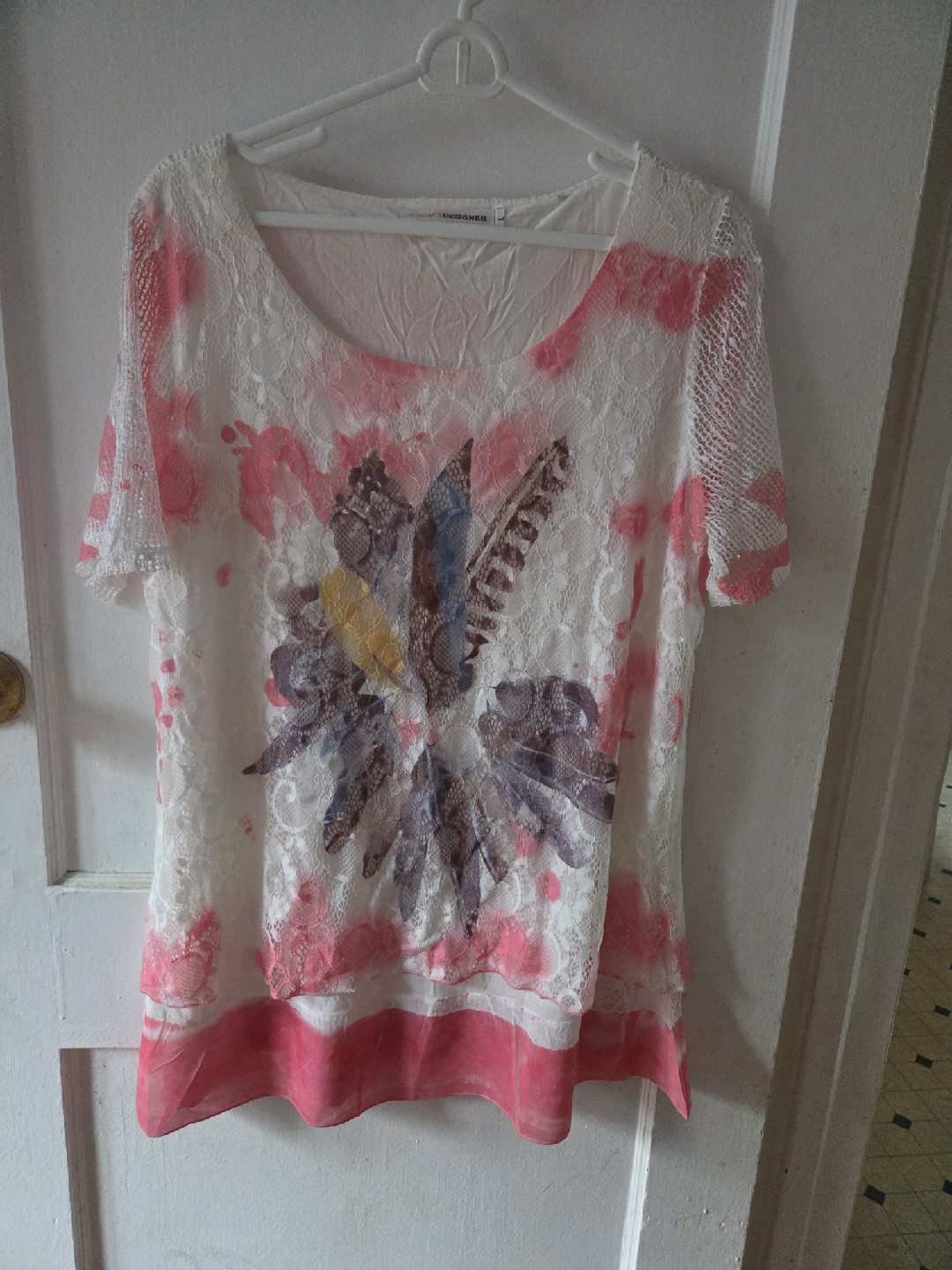Selling a cute lace top with a unique floral design! The top features a delicate lace overlay with pink accents and a colourful floral print. It's perfect for adding a touch of elegance to any outfit