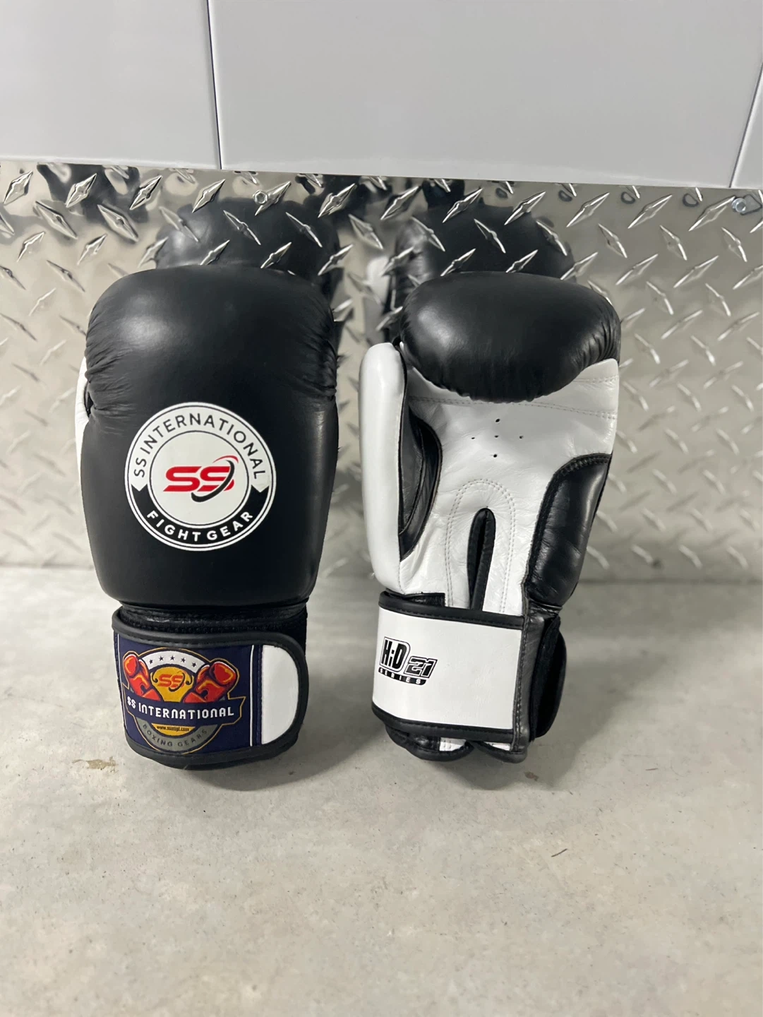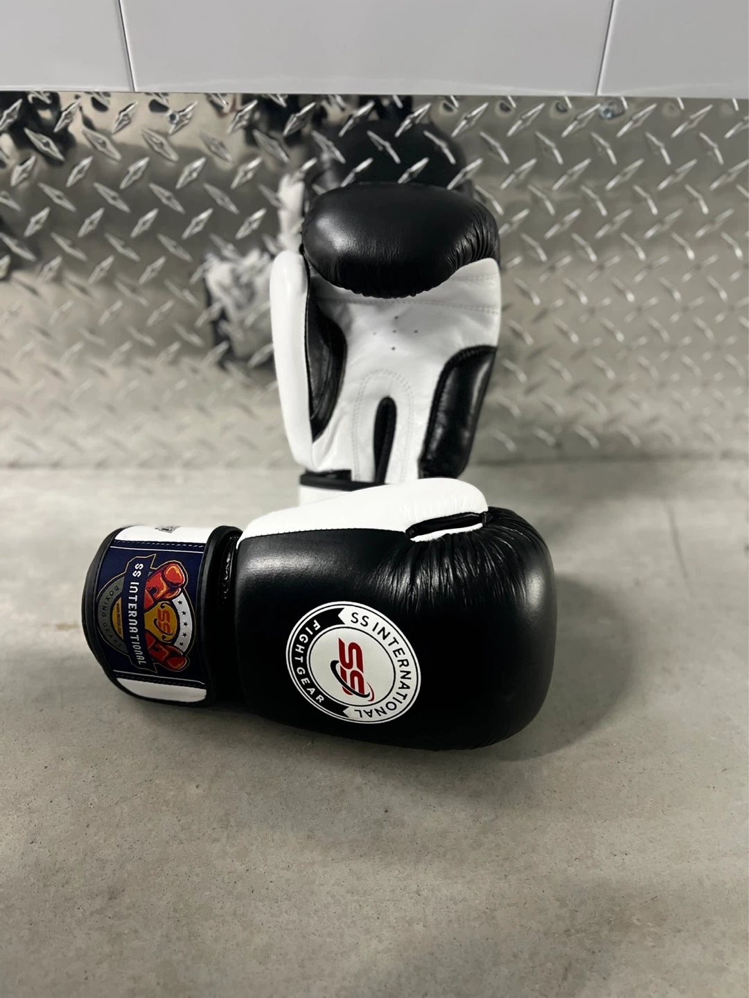 Brand new Black and white boxing gloves from SS International. These gloves are designed for fight gear. Suitable for training or sparring sessions. Available in all sizes, original cowhide leather