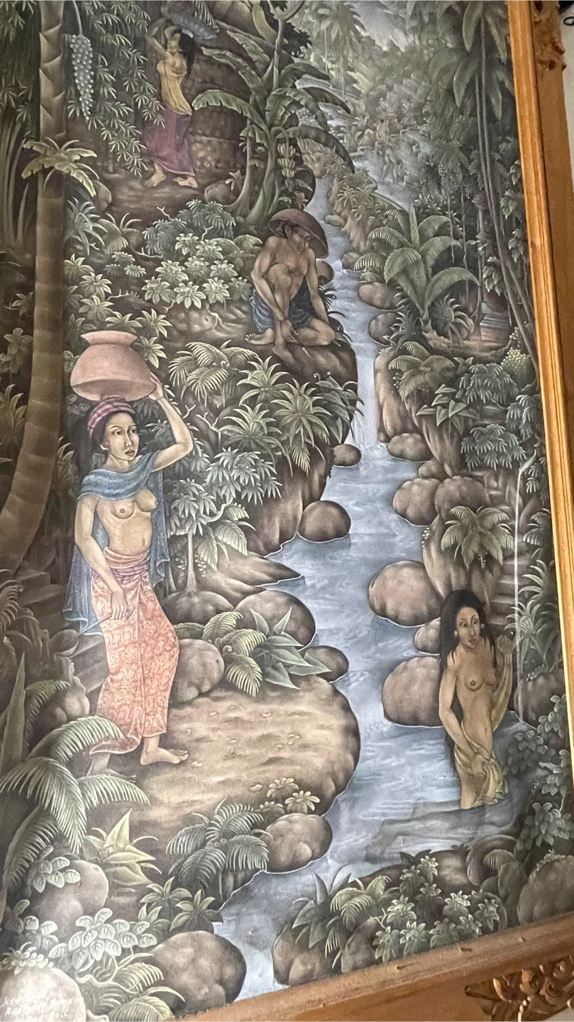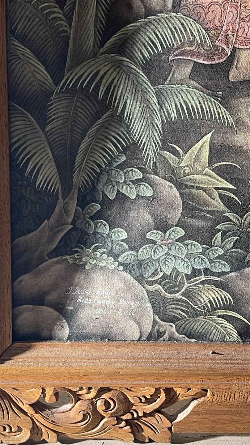 Beautiful Balinese painting in a carved wooden frame. The painting depicts a scene of people in a tropical landscape with a river. The frame is ornate and adds to the overall aesthetic of the piece. It's signed by I. Ketut Sadia, Rice Paddy Bengale, Ubud Bali