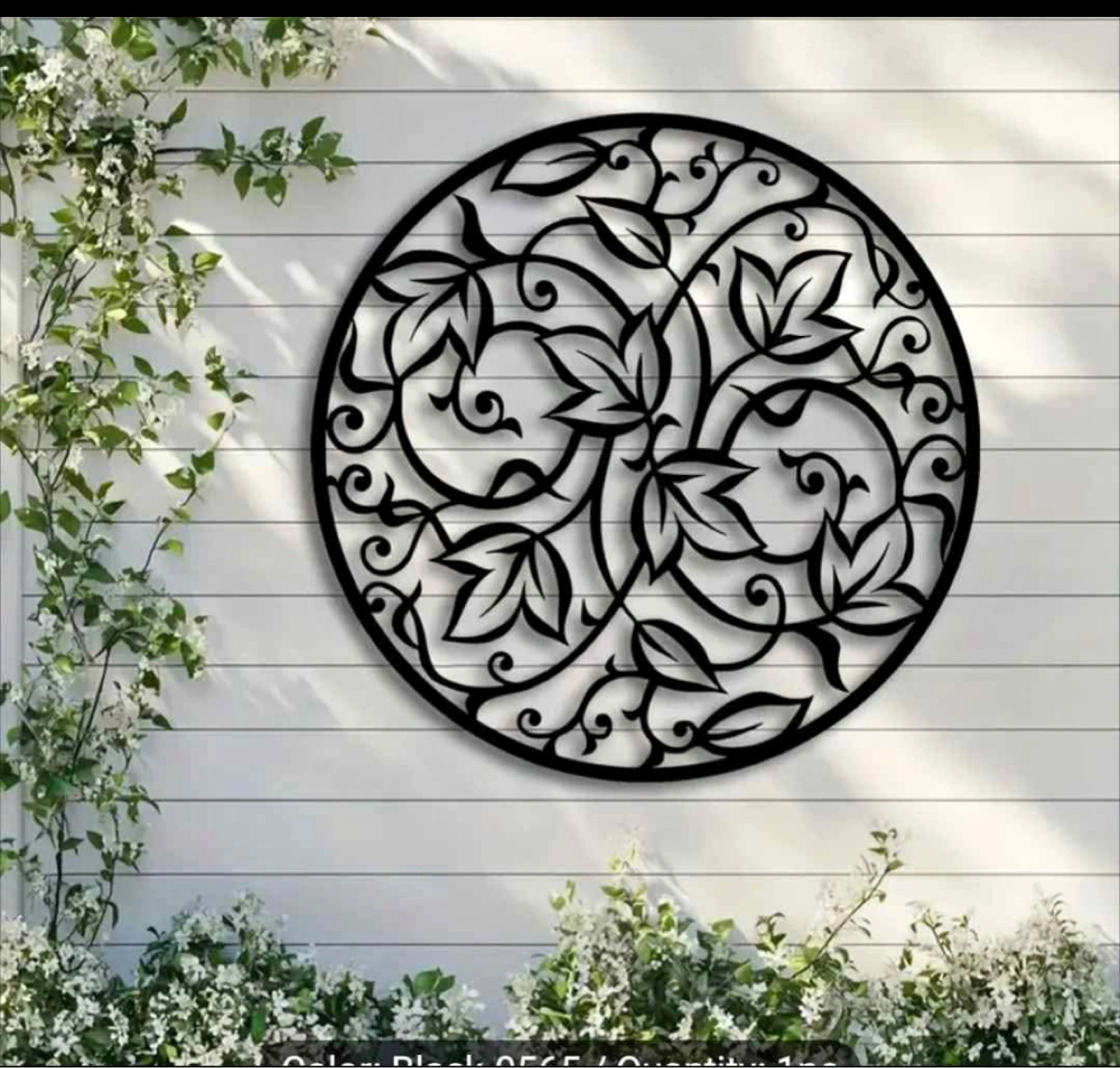 Elegant circular metal wall art. Features a black floral design. Perfect for adding a touch of style to any room. Intricate details.