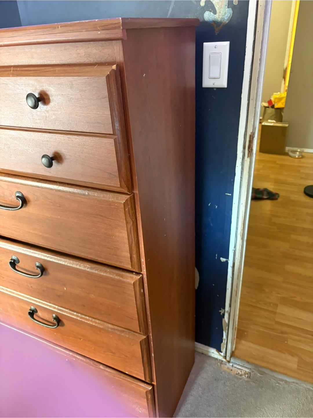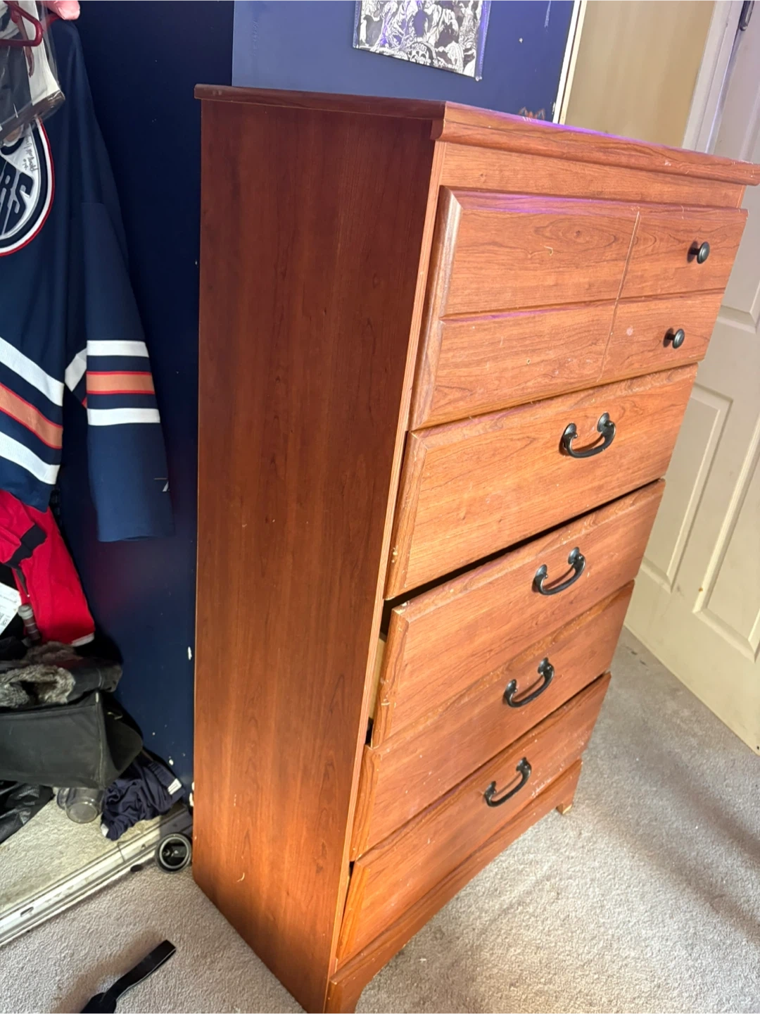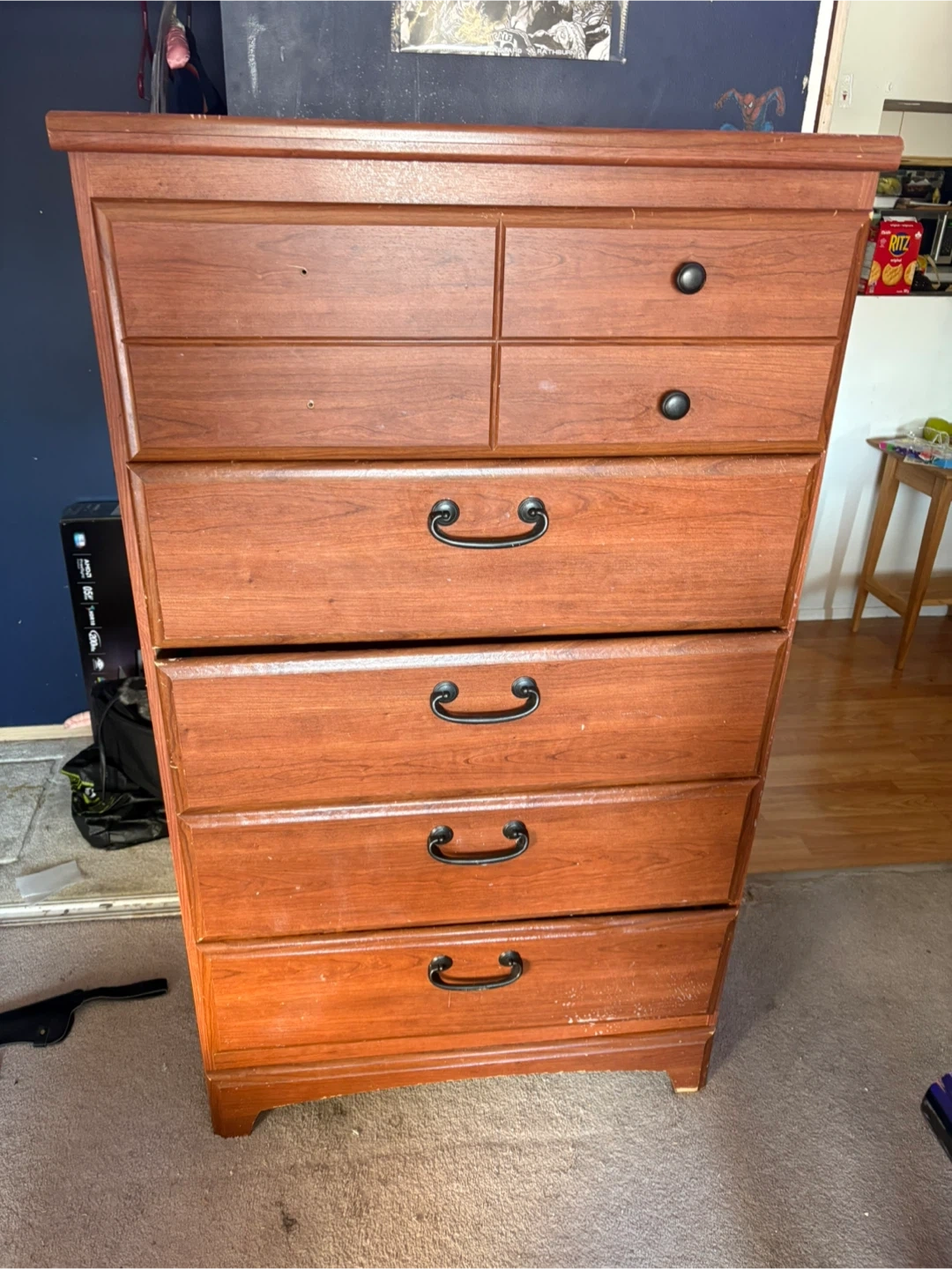A wood dresser with 5 drawers for ample storage. It features black metal handles and a warm wood finish. This dresser is great for organizing clothes and accessories in a bedroom. Top drawer is a bit broke on the inside but could easily be fixed