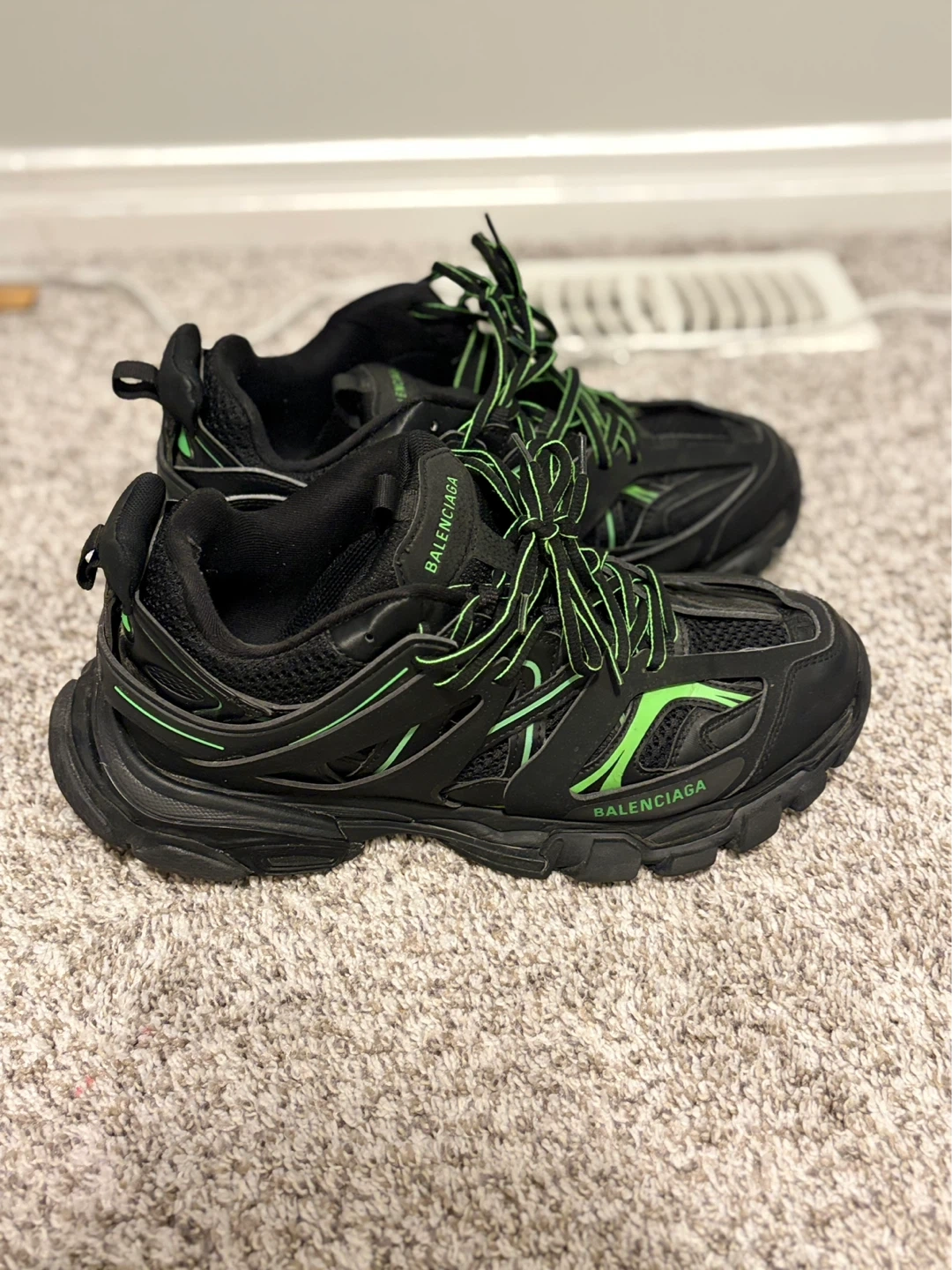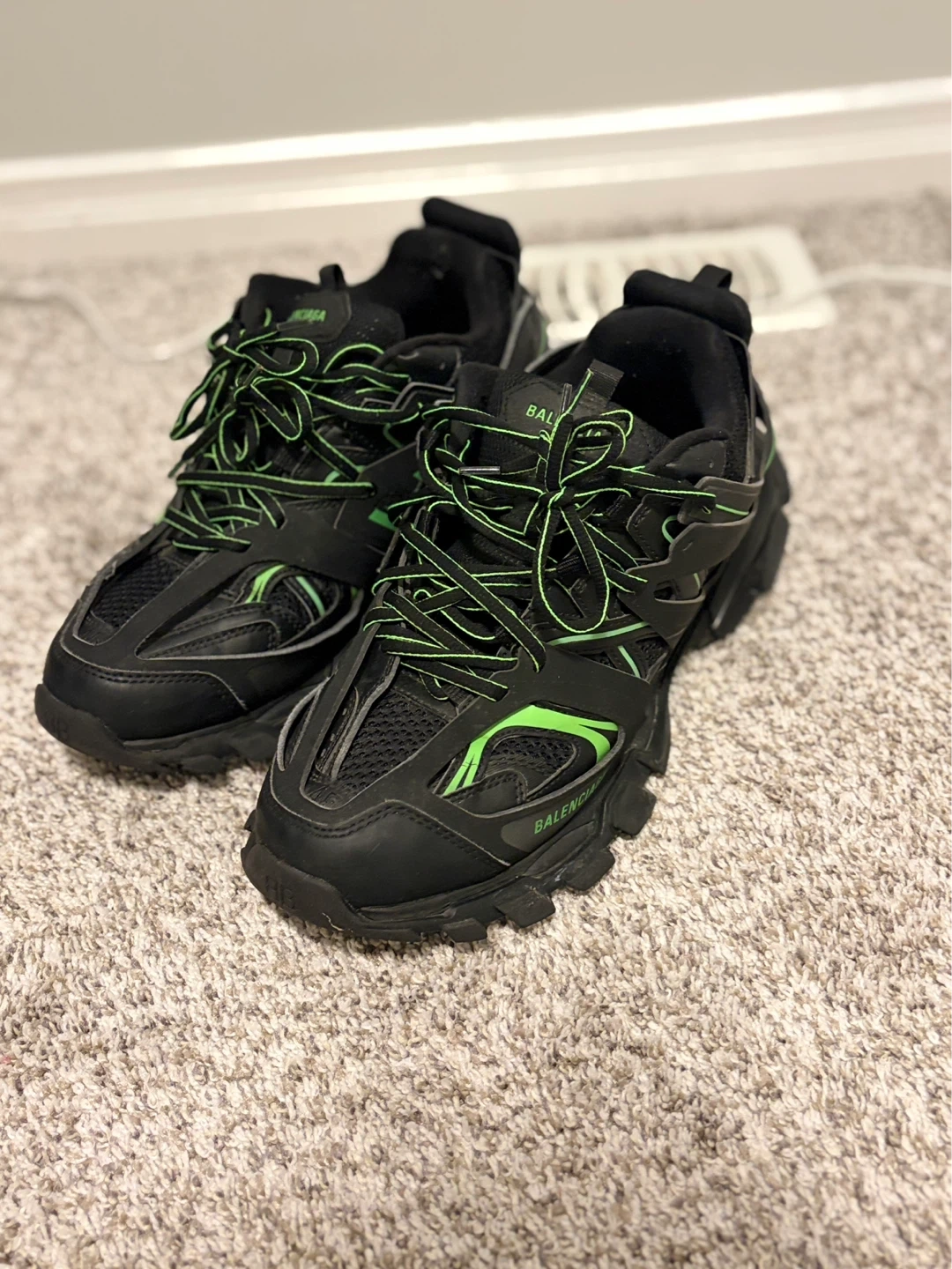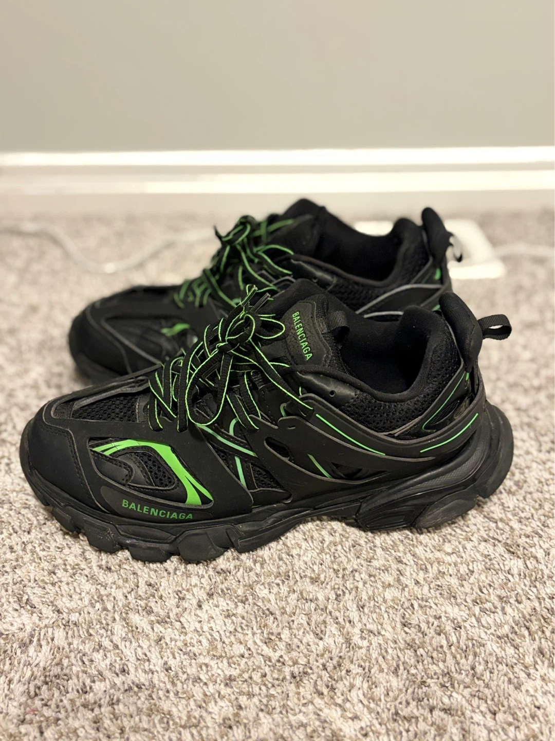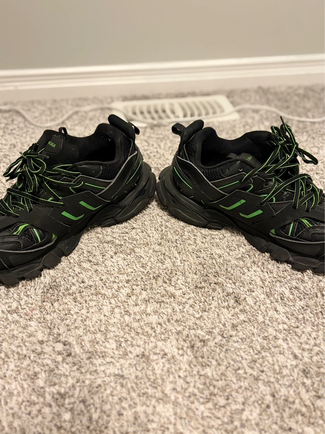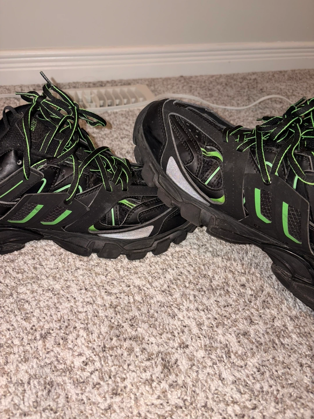 Balenciaga Track sneakers in black with neon green accents. These kicks are designed for comfort and style. Suitable for everyday wear or active pursuits!