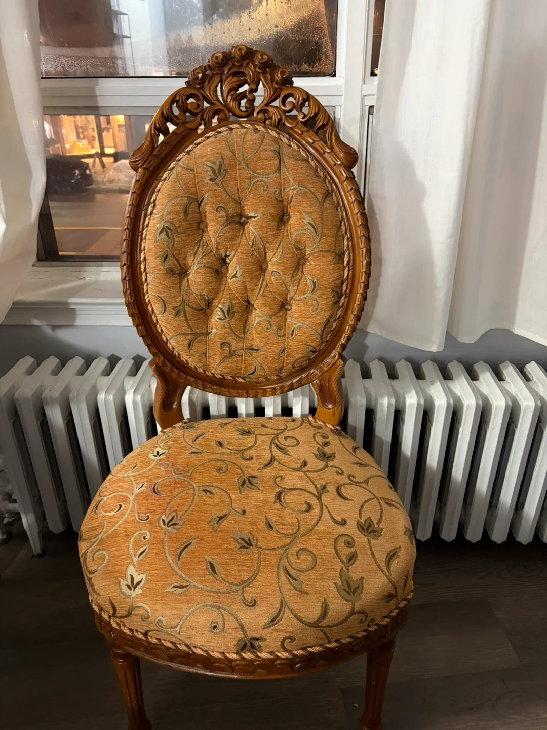 The wood carving is intricate, and the fabric has a classic damask pattern. This set would look great in a dining room or a decorative accent space.