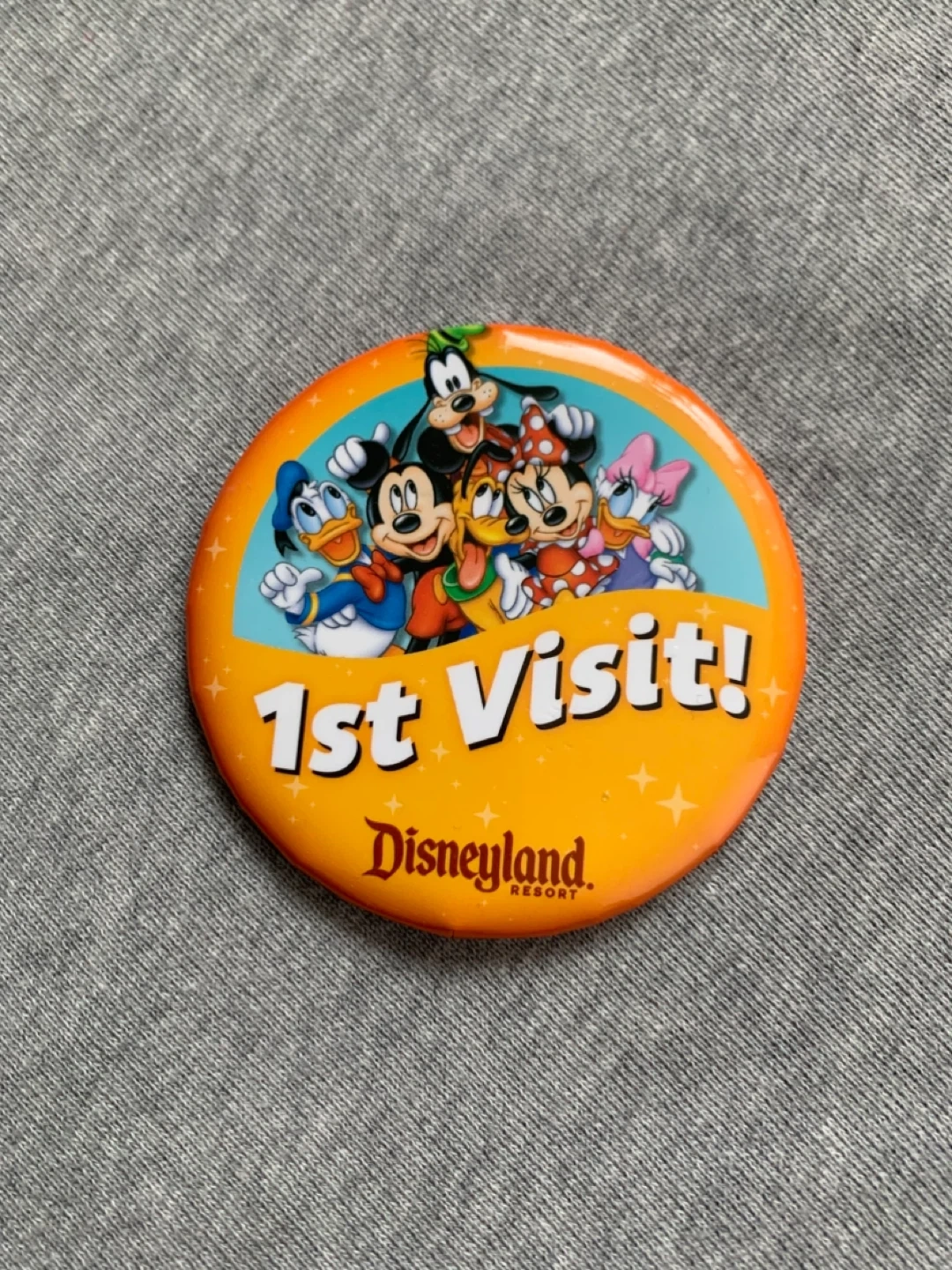 Commemorate a magical first trip with this Disneyland '1st Visit!' button pin. It features classic Disney characters like Mickey, Minnie, Donald, and Goofy. Pin it on your shirt or bag to show off your special day!