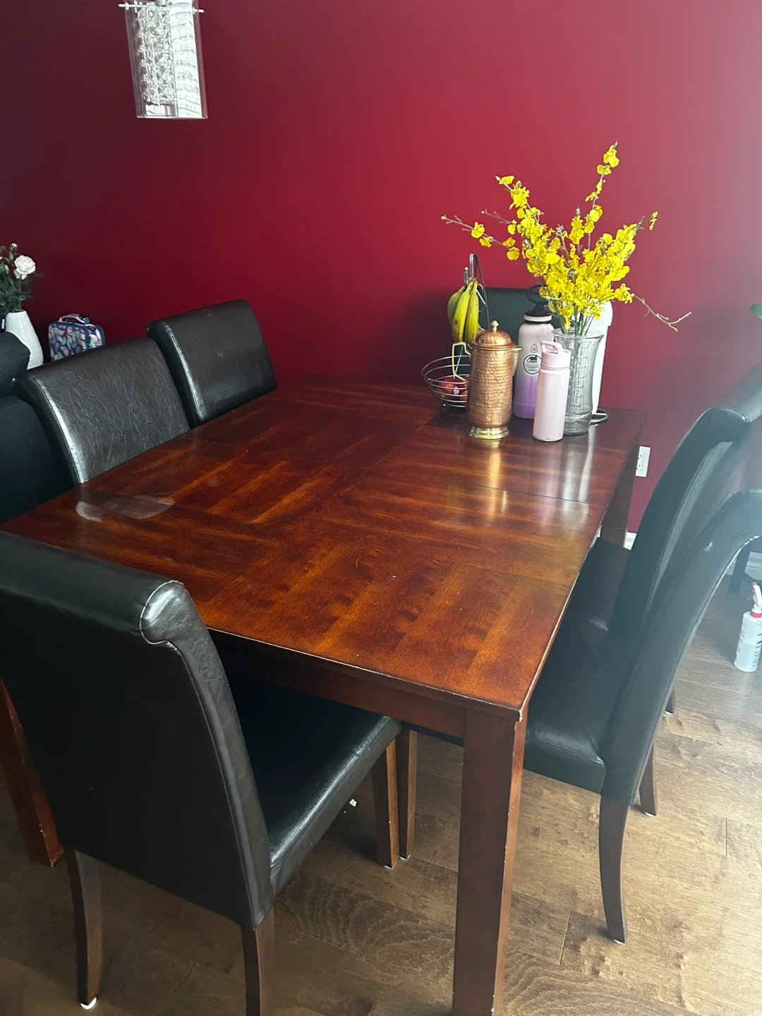 This beautiful wooden dining table comfortably seats six people. It's made of rich, dark wood with a parquet inlay design on the tabletop. The set includes six matching black faux leather chairs.it’s come with extension.