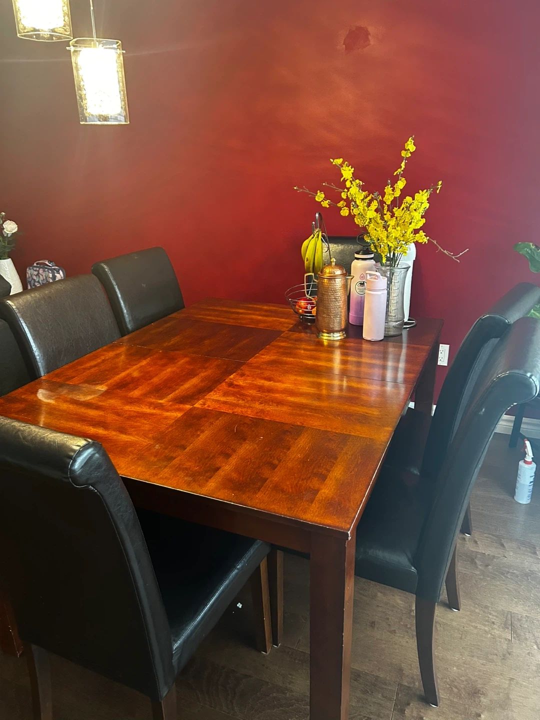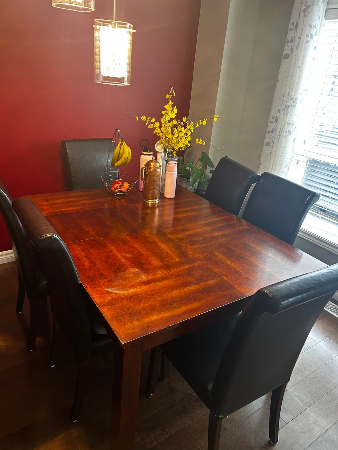 This beautiful wooden dining table comfortably seats six people. It's made of rich, dark wood with a parquet inlay design on the tabletop. The set includes six matching black faux leather chairs.it’s come with extension.