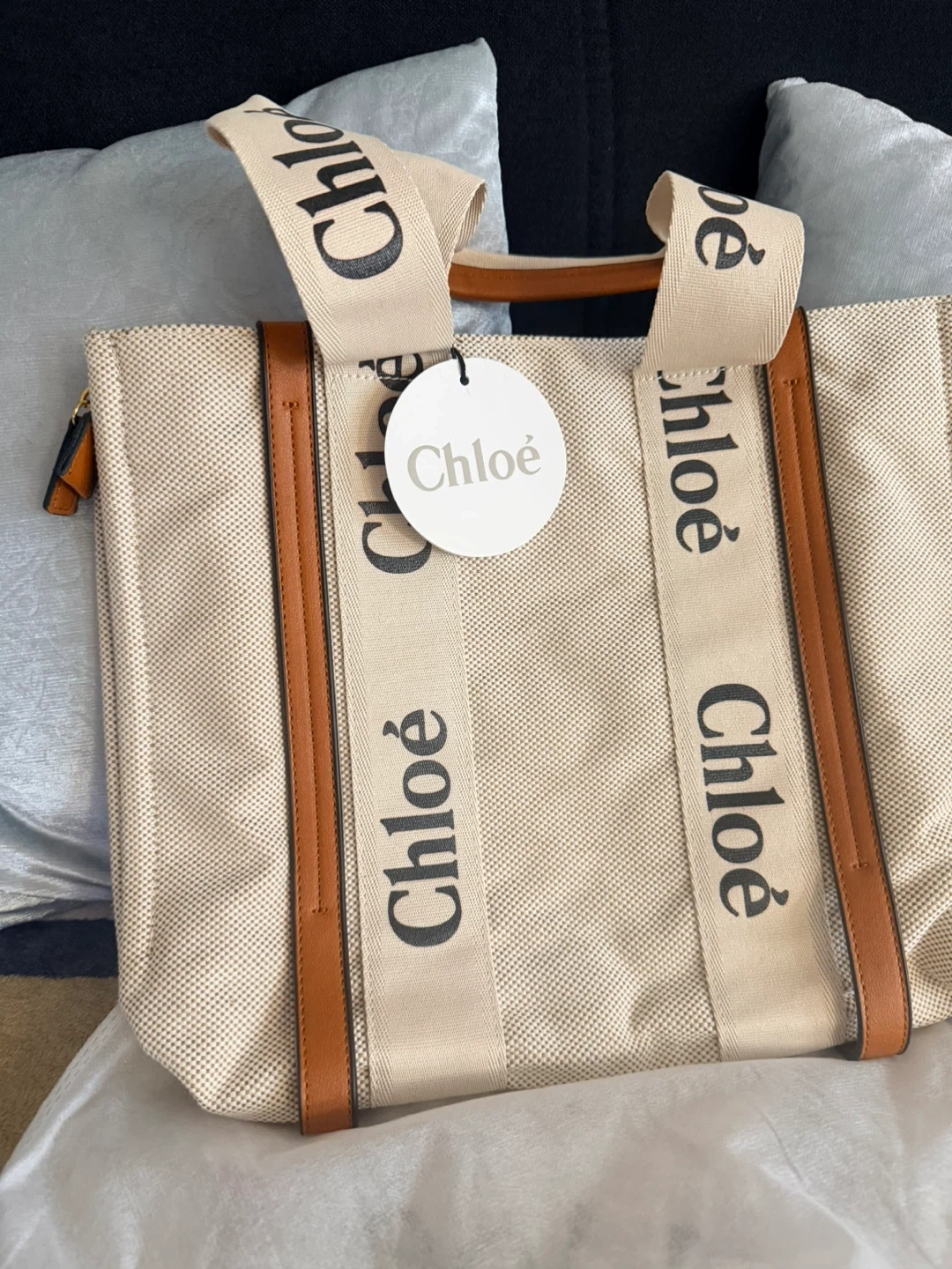 Chloé Woody tote bag in canvas with leather trim. It's a medium size bag. This bag is perfect for everyday use!