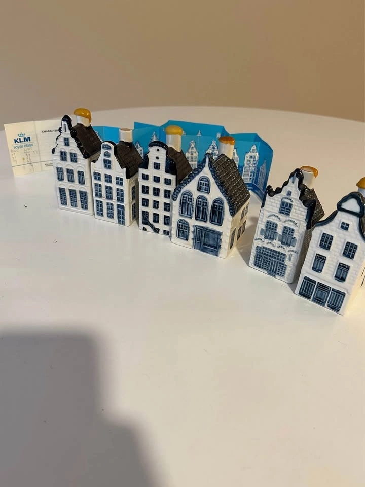 Rare opportunity to own a set of 6 authentic KLM Royal Dutch Airlines Delft Blue miniature houses, produced by Bols Royal Distillery and exclusively available to Business Class passengers. Excellent vintage condition with no chips or cracks. All six houses are still sealed with the original cork (5 have a wax or wax-like seal, and one has cork only as originally produced). Three contain the original Bols Dutch Genever (Gin), and the Genever has dried up in the other three as often happens. These have been well-preserved and include the original collector’s pamphlet. House Numbers Included: #14: Daendels House (Elburg), #19: Boerhaave House (Leiden), #20: Edam Museum (Edam), #25: Teylers Museum (Haarlem), #30: Hippolytusbuurt 8 (Delft), #49: University of Amsterdam (Amsterdam). Made in Holland by Bols Royal Distilleries. Pickup available in Bucktown (Chicago). Price: $20. Cash only.