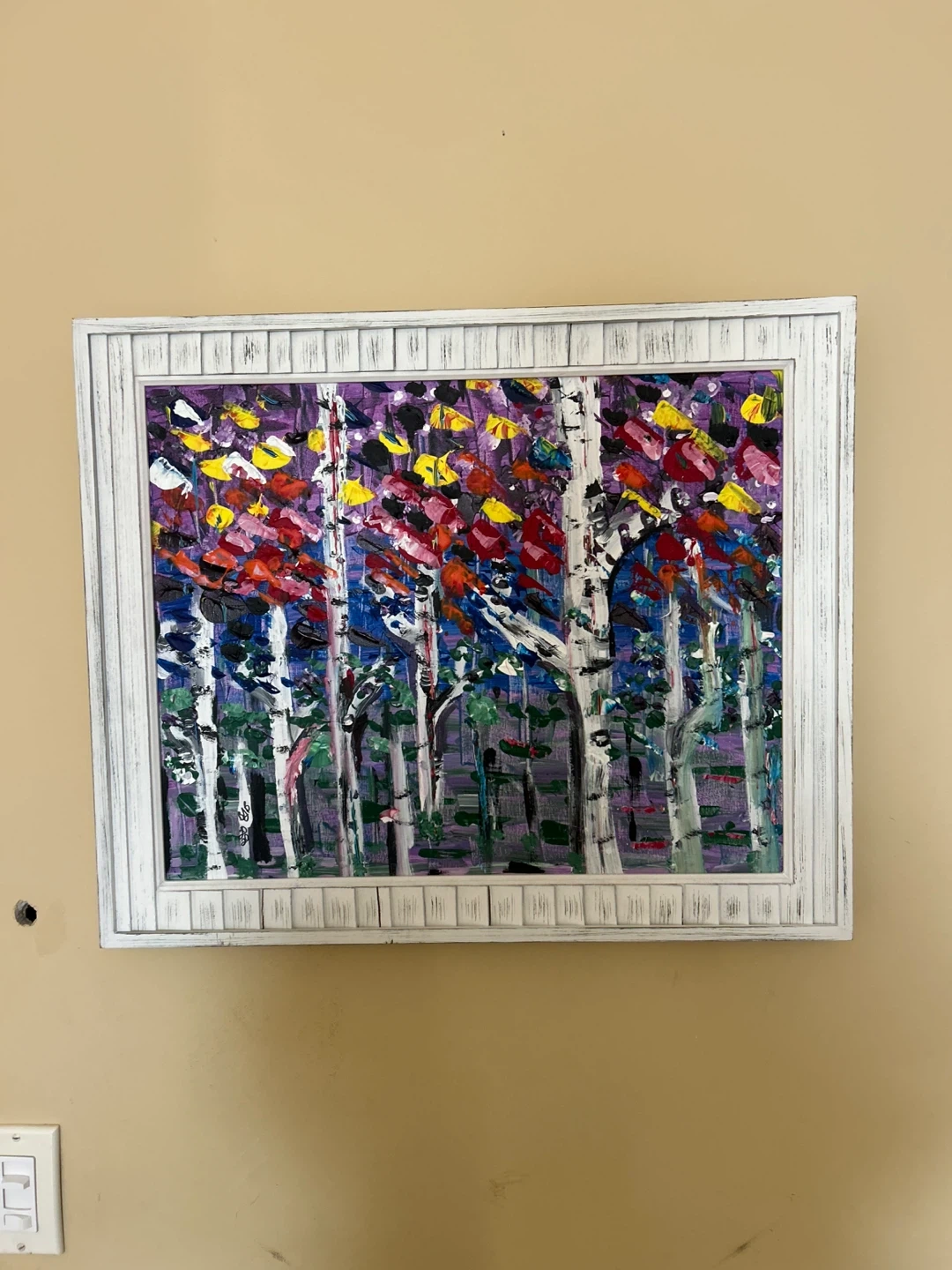 Textured impasto painting of a birch tree forest in vibrant colours. It's framed in a distressed white wood frame. This piece adds a colourful touch to any room!