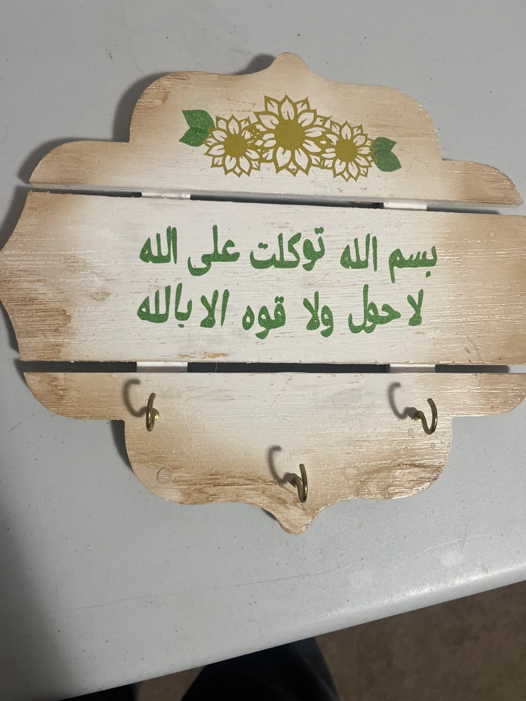This wooden wall hanging features a beautiful Arabic inscription and decorative sunflowers. It comes with hooks to hold your keys. Made of wood.