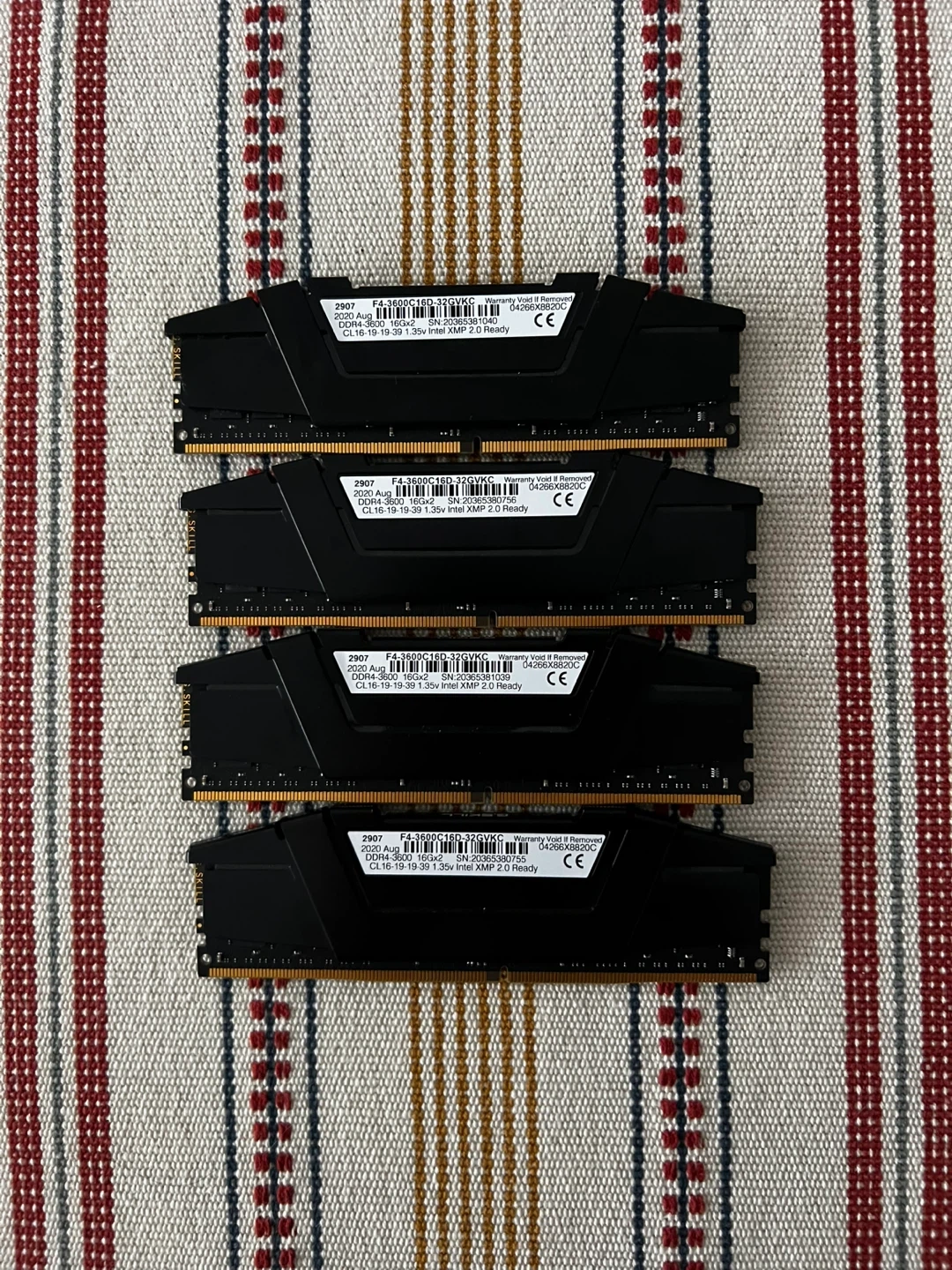 Set of four G.SKILL Ripjaws V DDR4 RAM modules. Each stick is 16GB , totalling 64GB.