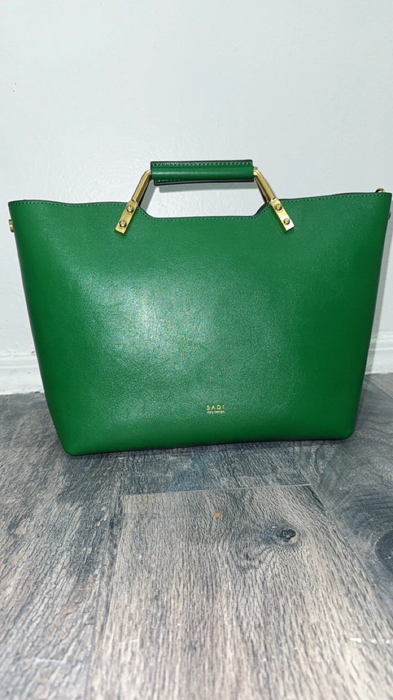 This SADI handbag is crafted from smooth green leather. It features elegant gold-tone hardware on the handles. The structured design makes it a stylish accessory for everyday use.