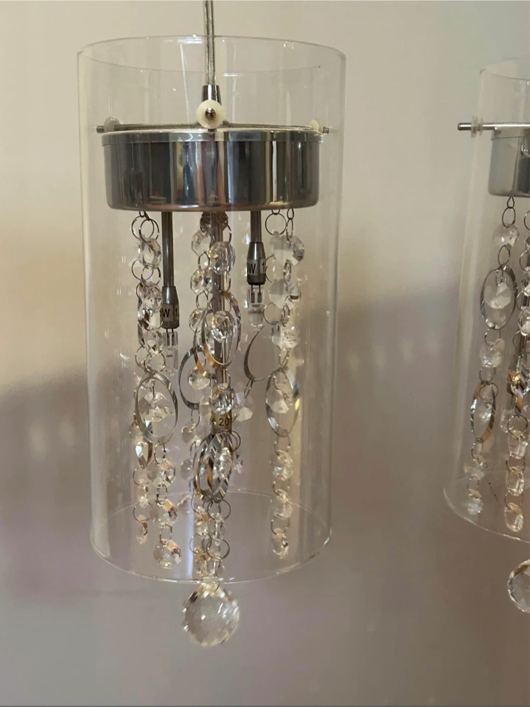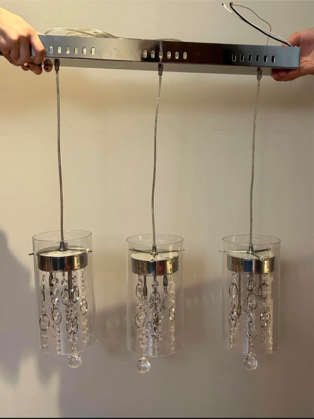 This elegant chandelier features three clear glass cylinders with cascading crystal accents. It's a stylish addition to any room. Chrome finish with adjustable wire suspension.