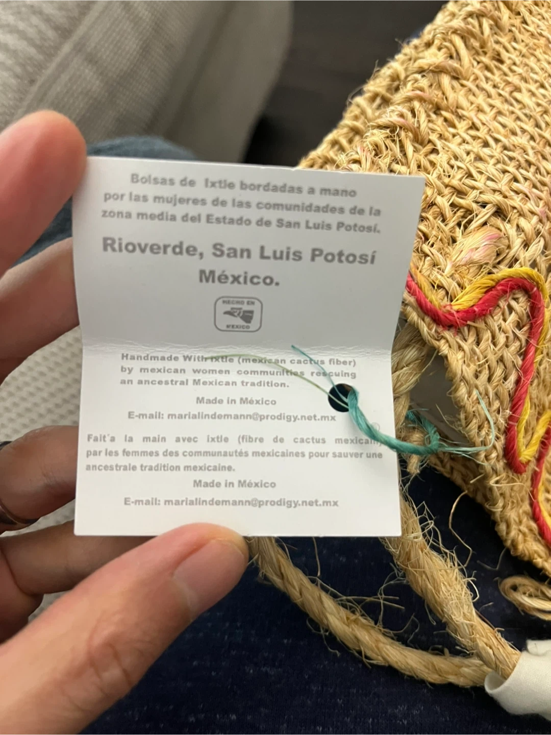 Handmade bag crafted from ixtle (Mexican cactus fiber). It's woven with a natural burlap-like texture and features colourful embroidered flowers and butterflies. The interior is lined with fabric and has a small pocket. This unique bag is made in San Luis Potosí, Mexico by local artisans.