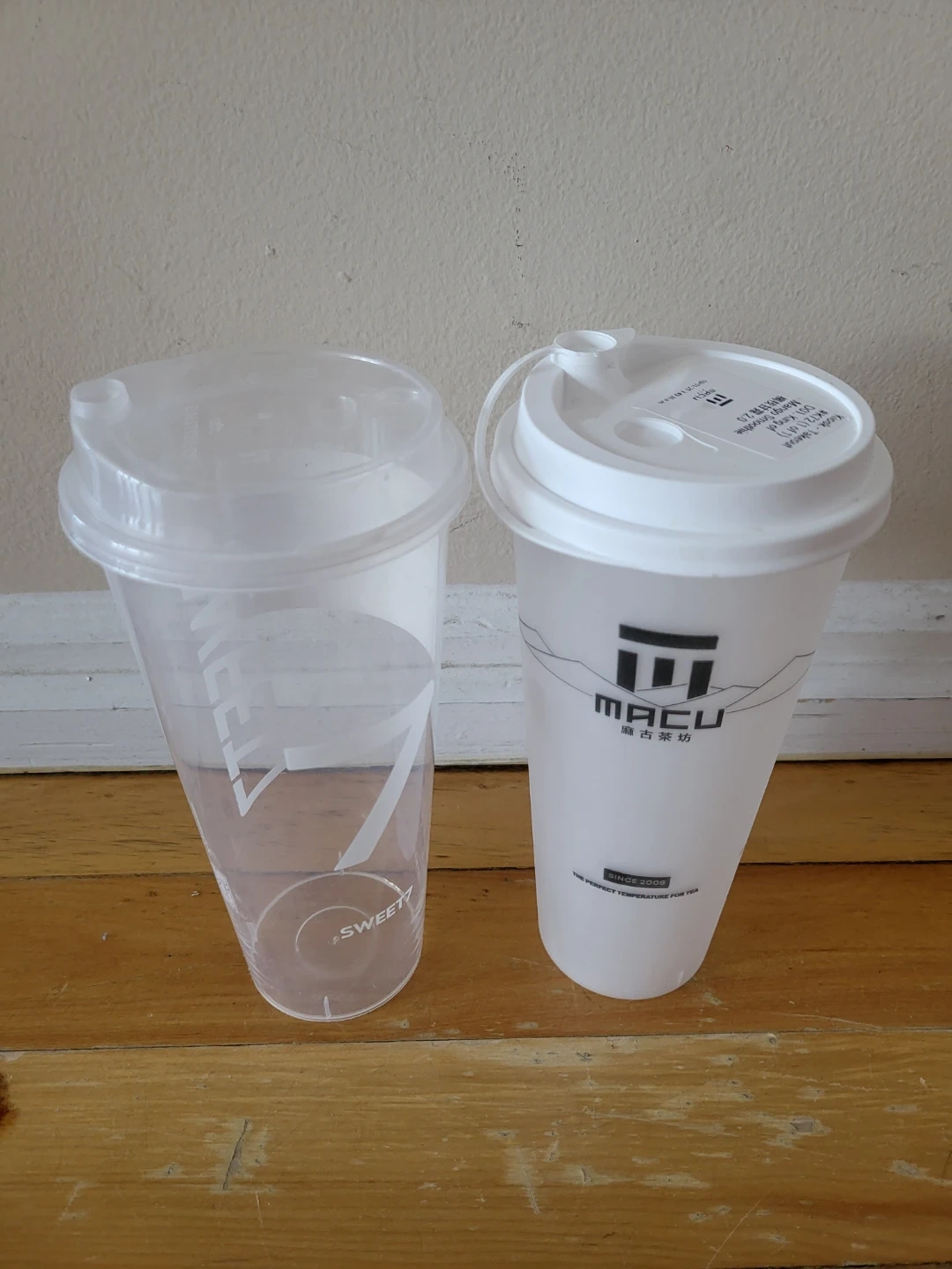 2x plastic tumblers with lids, one branded MACU and the other has "SWEET 7". These reusable cups are great for beverages on the go. They're made of durable plastic.
