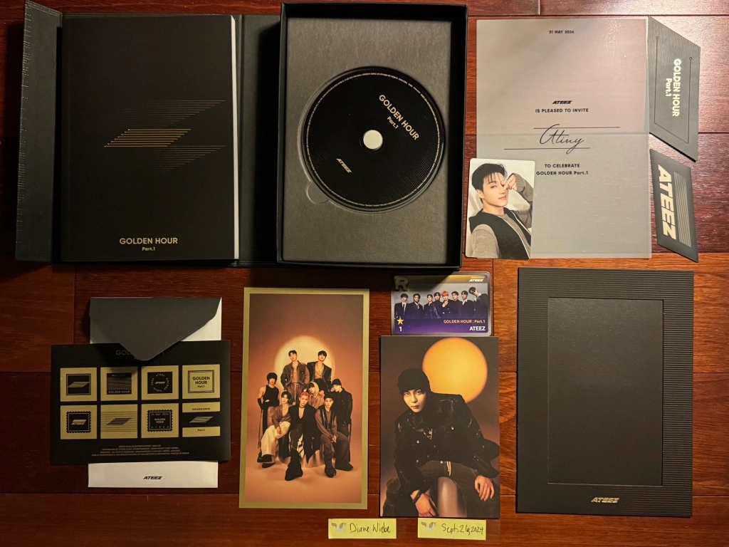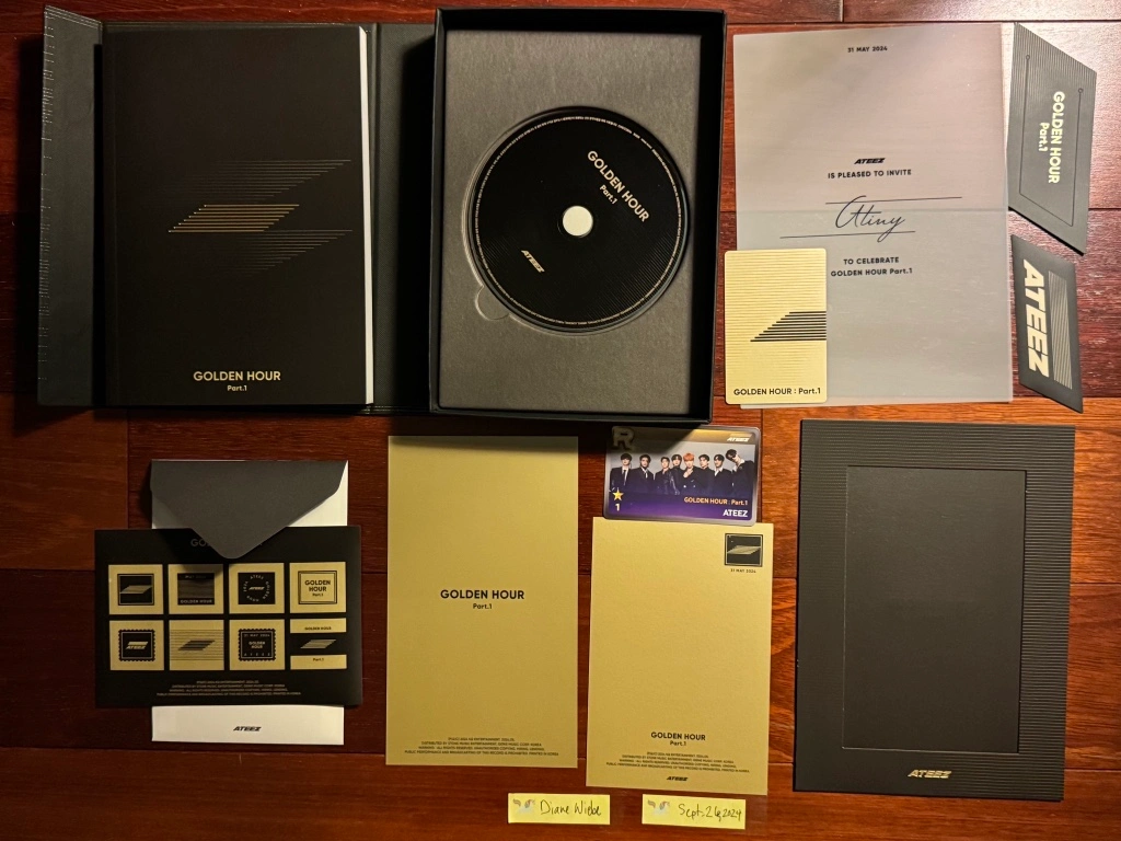 It includes: CD, photobook, Wooyoung “Golden Hour”version album PC, Jongho “Golden Hour” version postcard, ATINY invitation, ATEEZ group photo + frame, bookmark, and stickers (both the sheet & the ATEEZ logo).