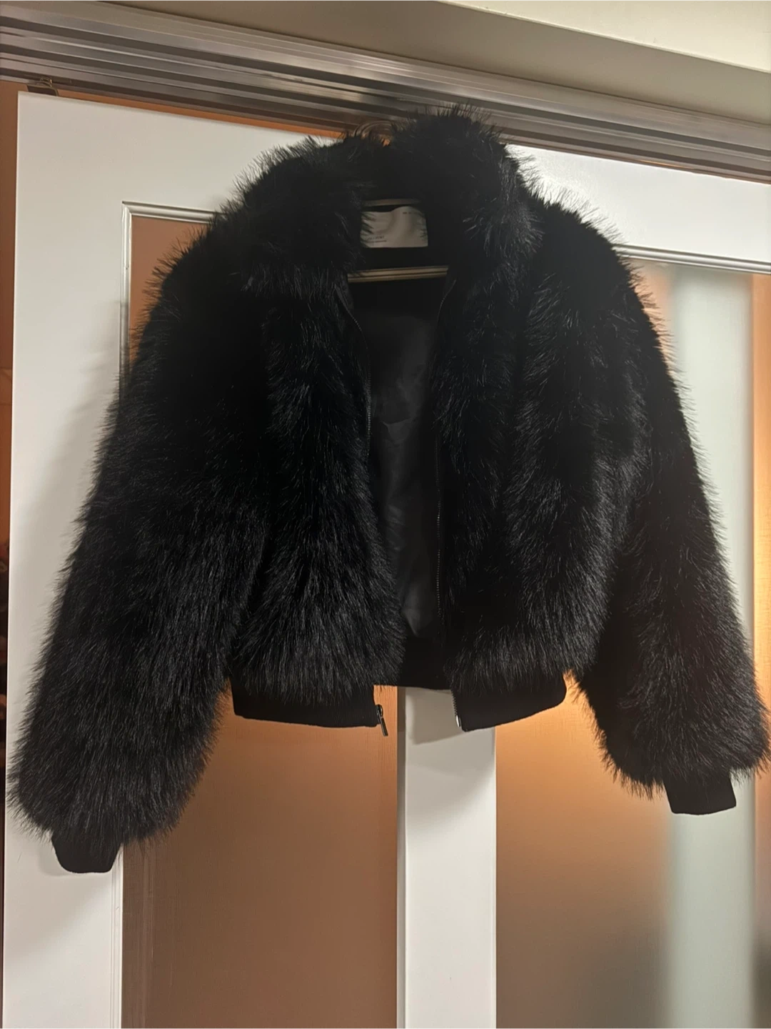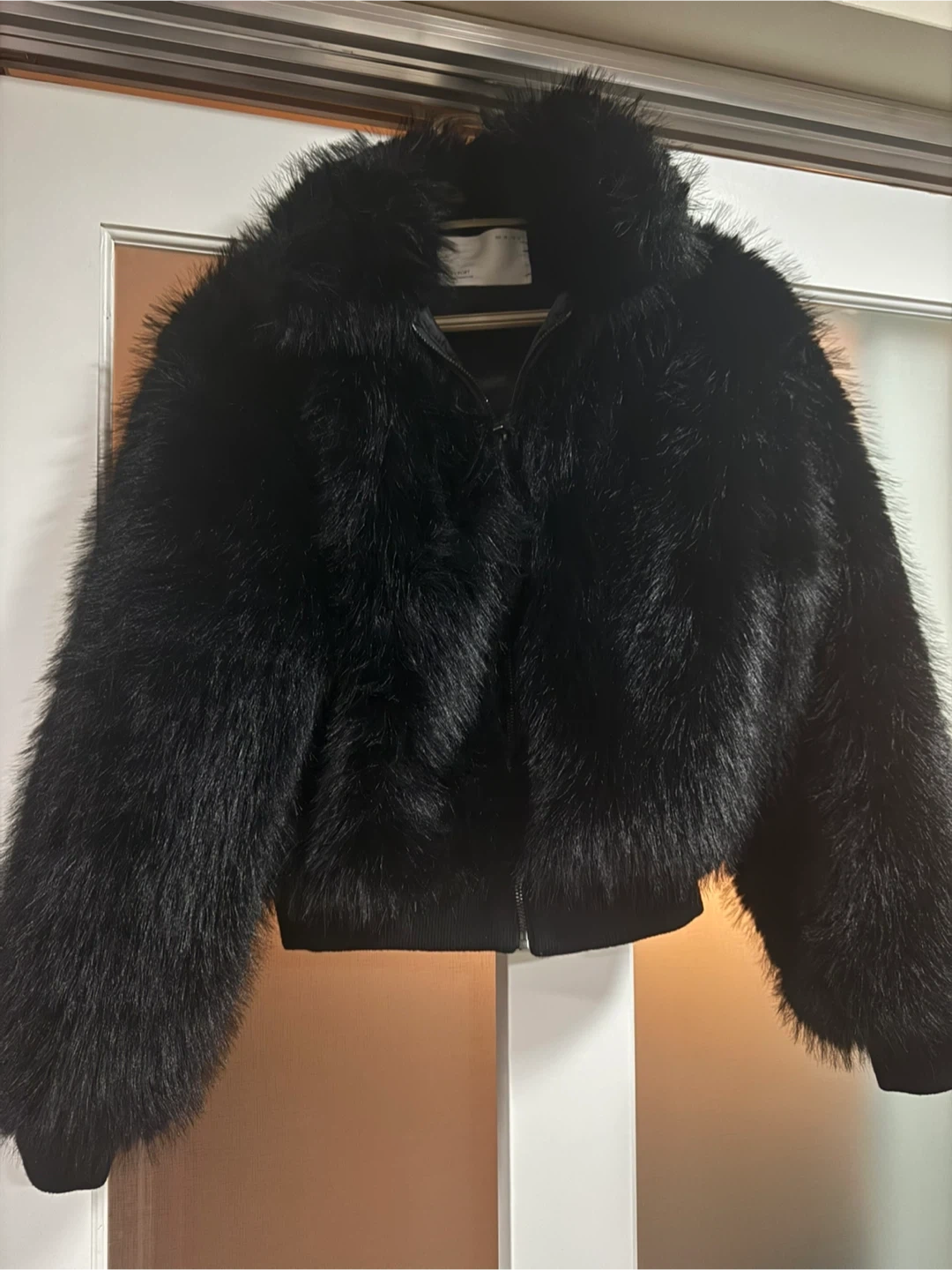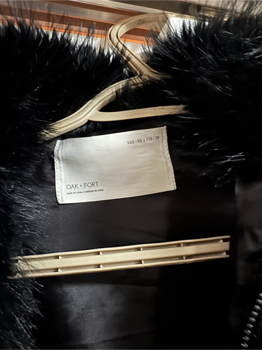 Cozy up in this Oak + Fort faux fur bomber jacket! It's a size XS and features a stylish, cropped silhouette. Perfect for adding a touch of glam to any outfit
