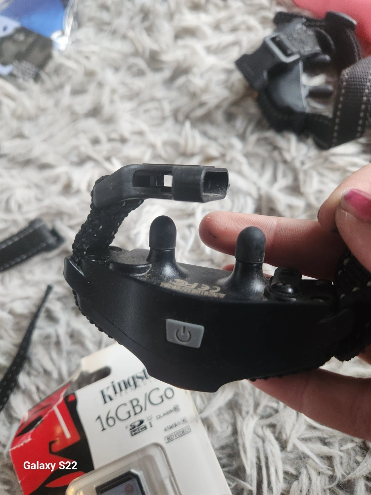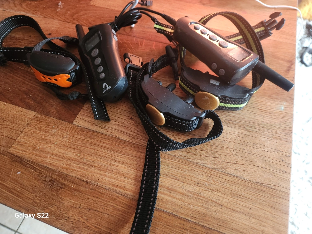 Package includes two dog training collars with remotes, one orange harness, one red harness, and one black muzzle. Great for training your canine companion. Some wear and tear expected from use.