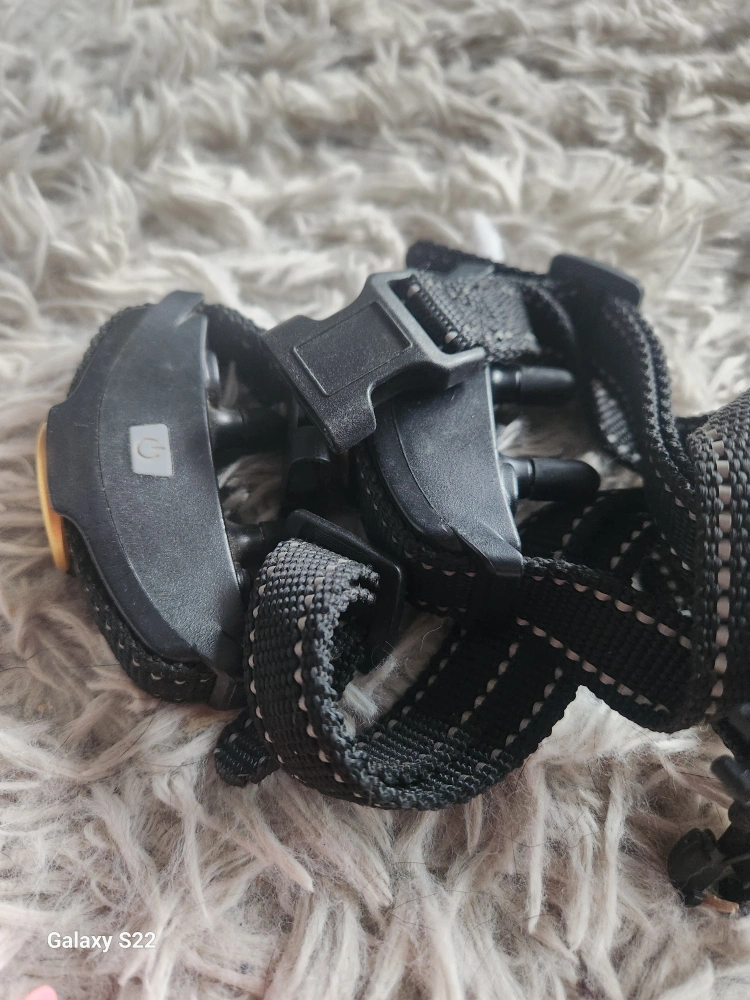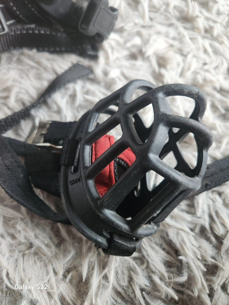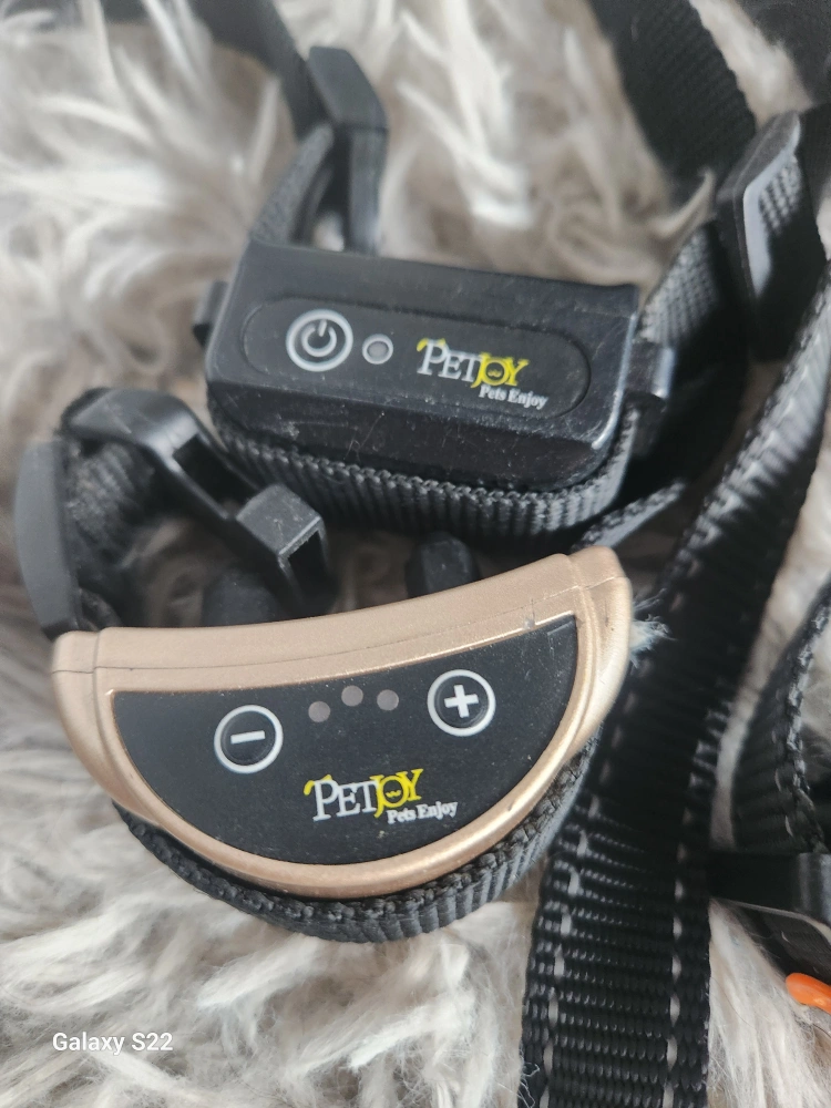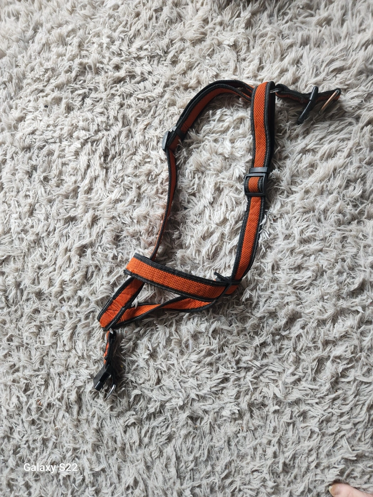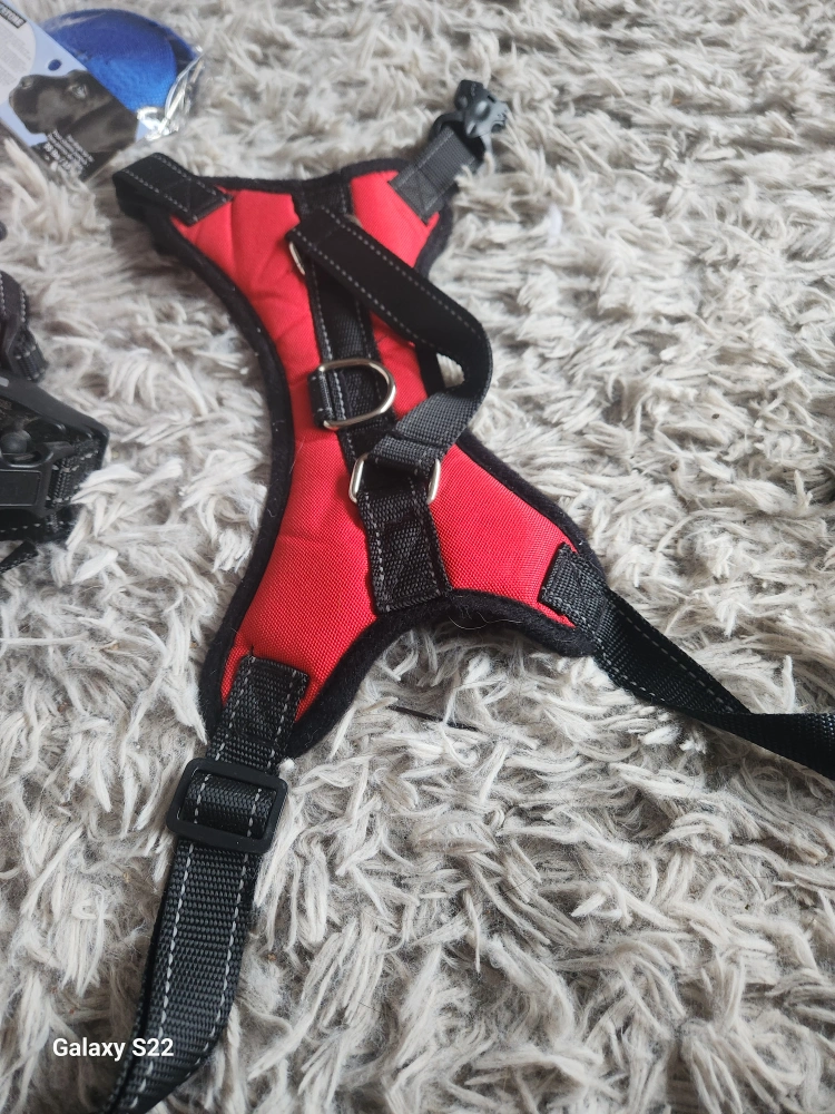 Package includes two dog training collars with remotes, one orange harness, one red harness, and one black muzzle. Great for training your canine companion. Some wear and tear expected from use.
