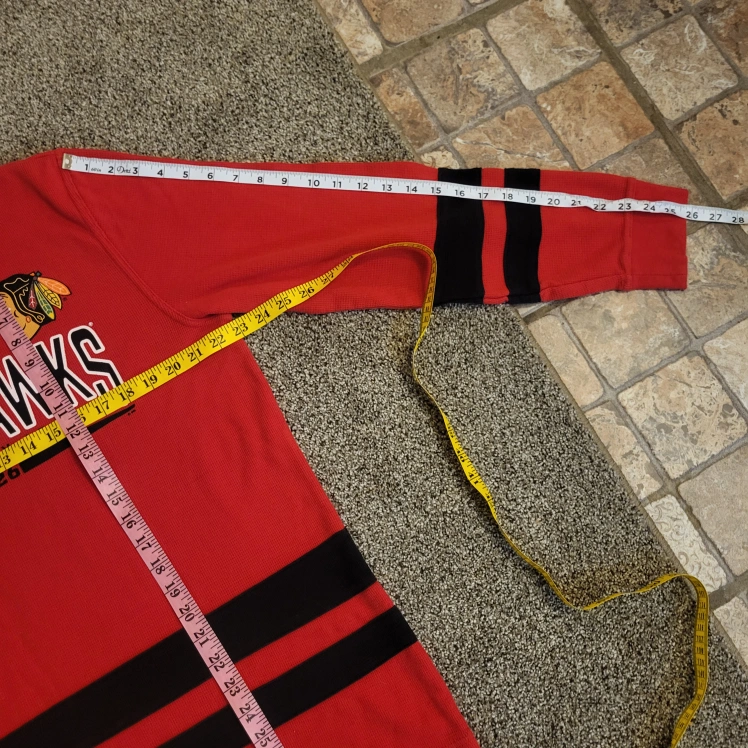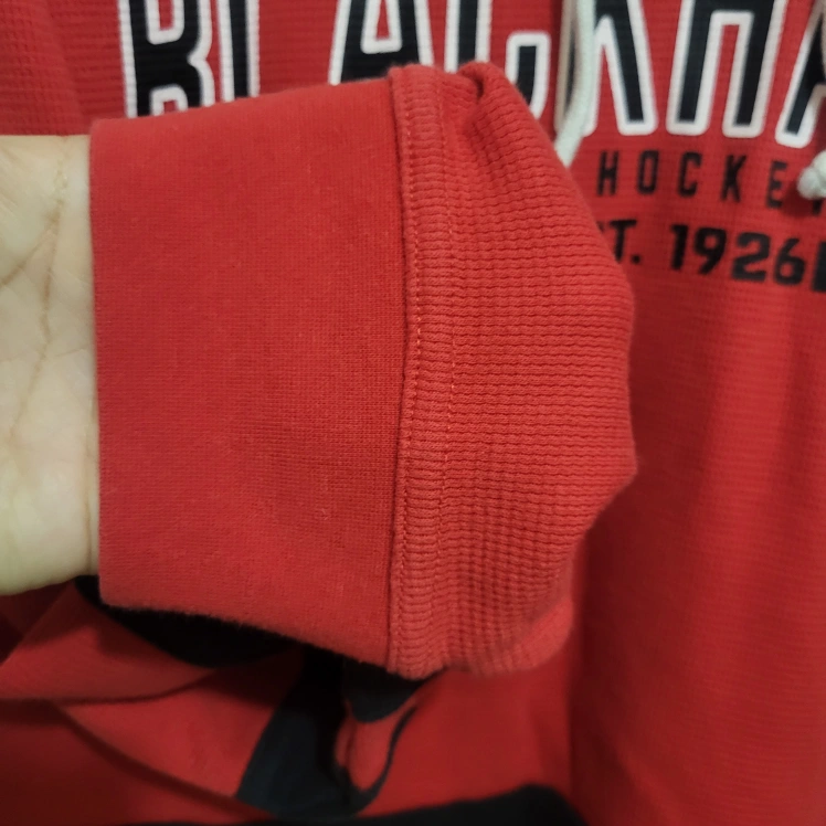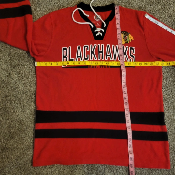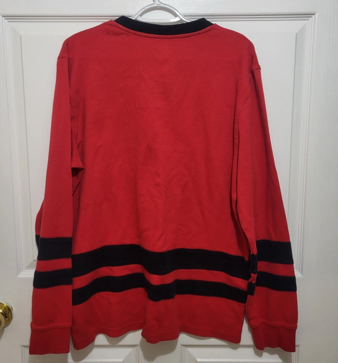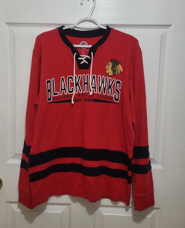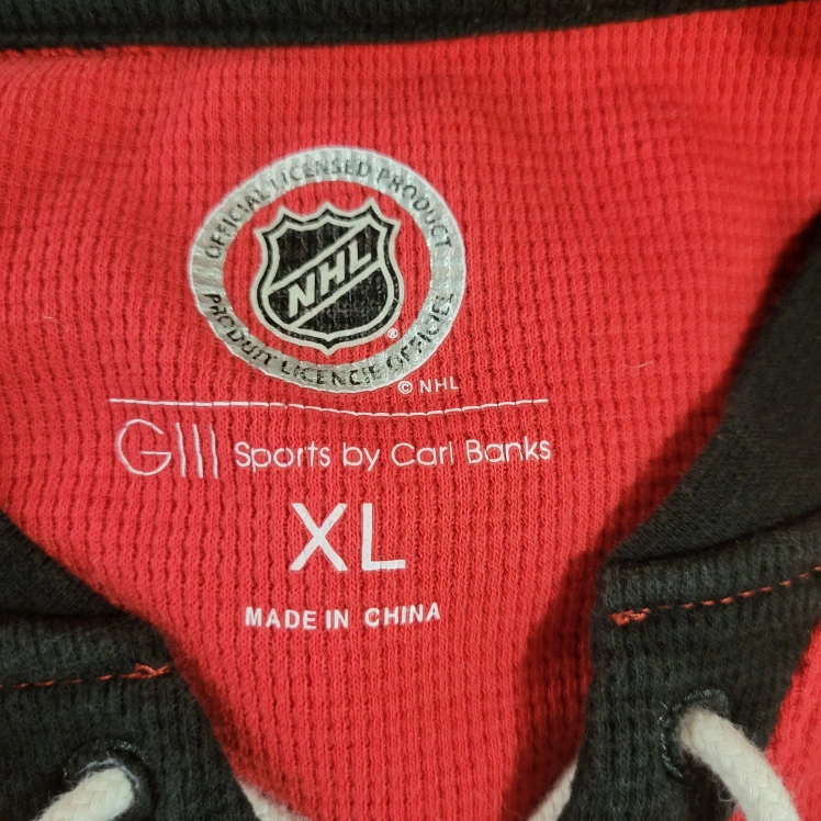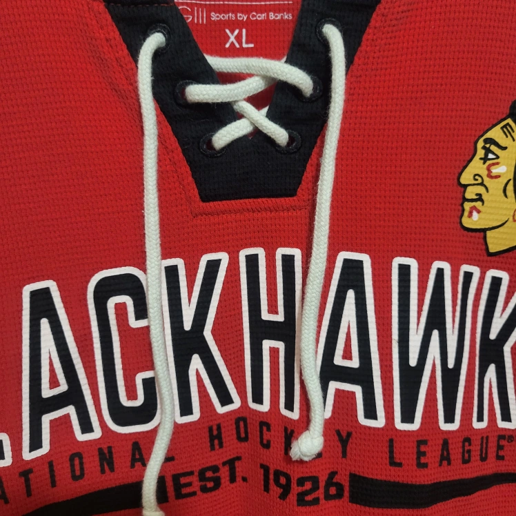 Show your support for the pre-owned Chicago Blackhawks with this officially licensed GIII Sports By Carl Banks NHL hockey long-sleeve shirt. Made of 60% cotton and 40% polyester, this red sweater is perfect for any time, whether you're watching the game at home or cheering on your team at the rink. Size XL designed for men, featuring the iconic Blackhawks logo and a front lace up closure. This waffle knit shirt is the perfect addition to any fan's collection and is a must-have for any hockey enthusiast. It is made in China. Get ready to rock the ice in style with this GIII Sports By Carl Banks NHL licensed Chicago Blackhawks hockey sweater.