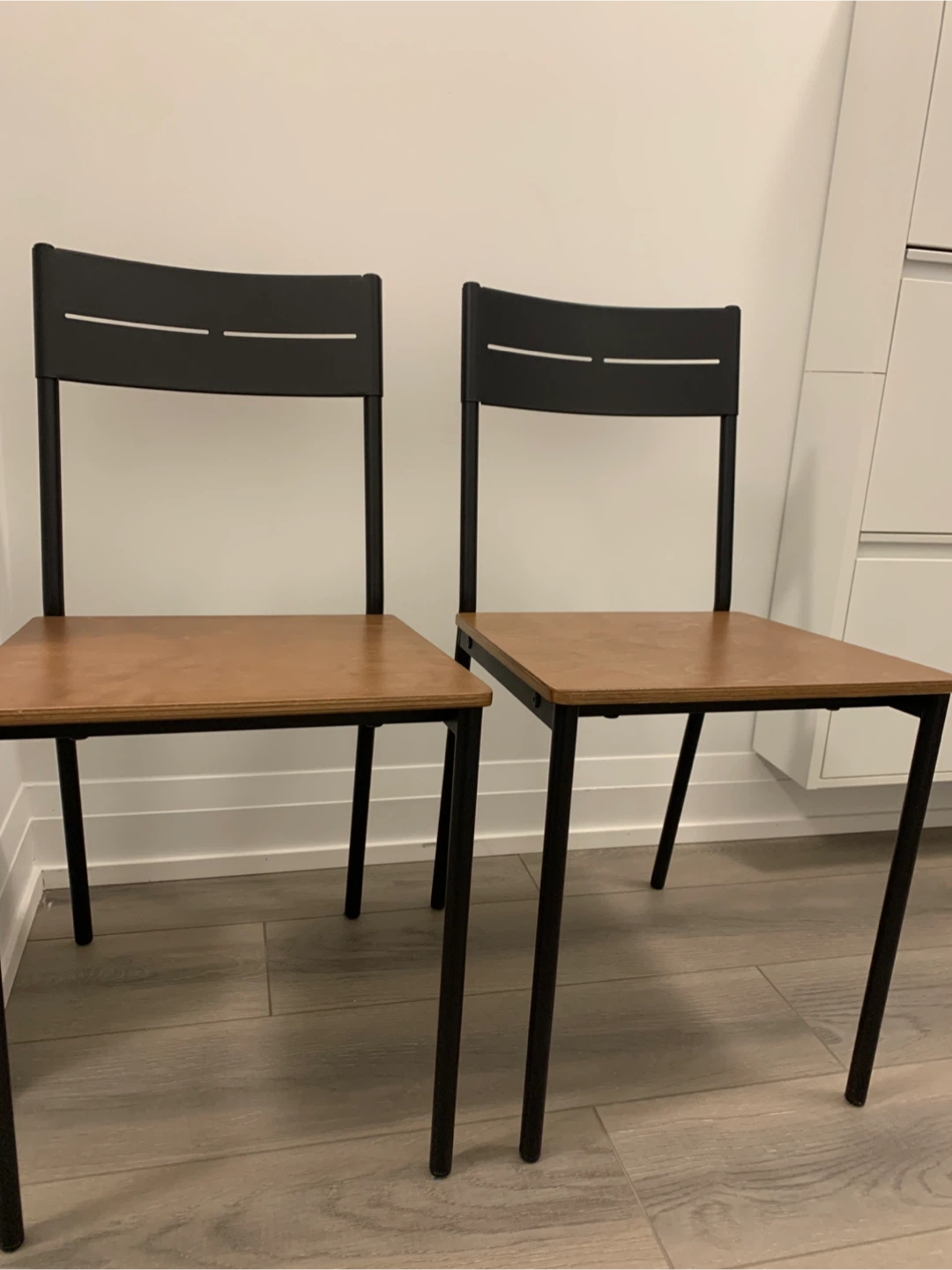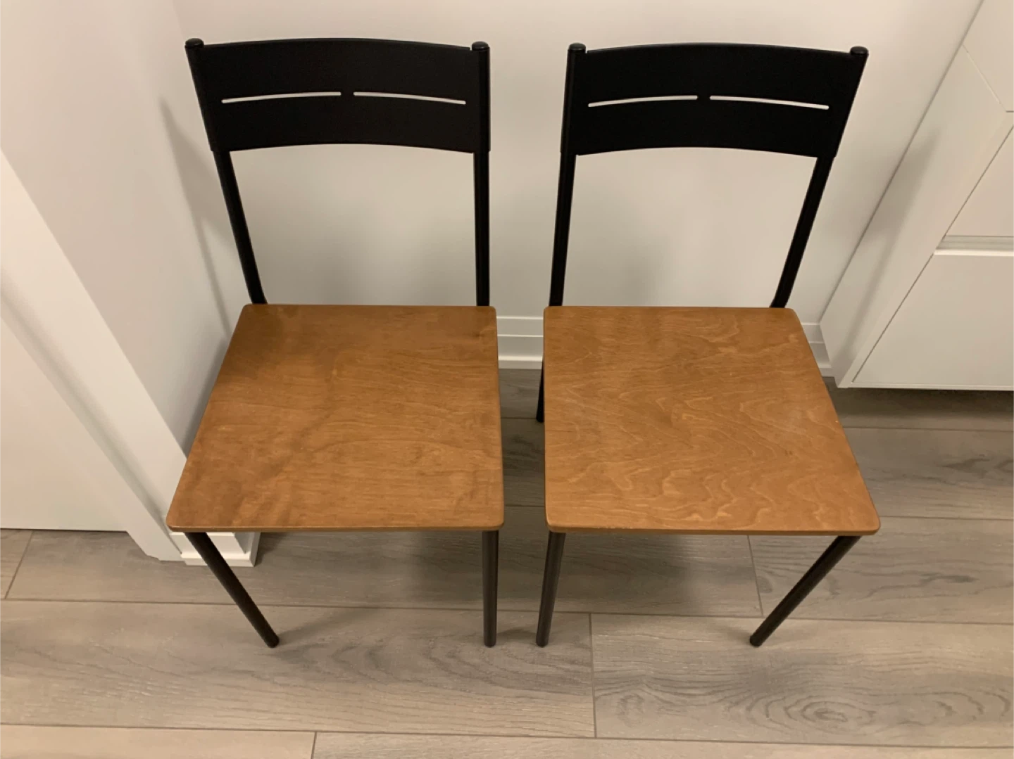 Set of 2 IKEA dining chairs with wood-look seats and black frames. Simple, modern design that fits well in kitchens, dining areas, or small spaces.