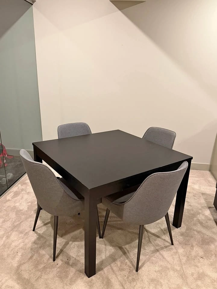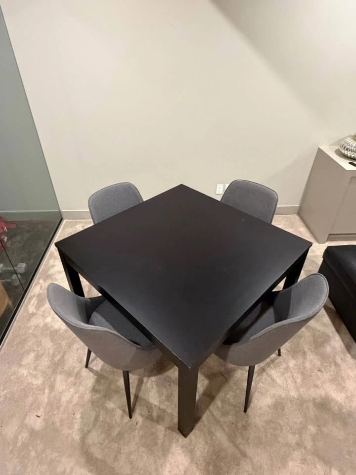 Dark wood dining table with a square top. Great for dinner or playing games. The legs detach. Please request if you would like the table dismantled or put together. Pick up only. Chairs not included. Table dimensions: 43x43 inches, 30 inches tall.