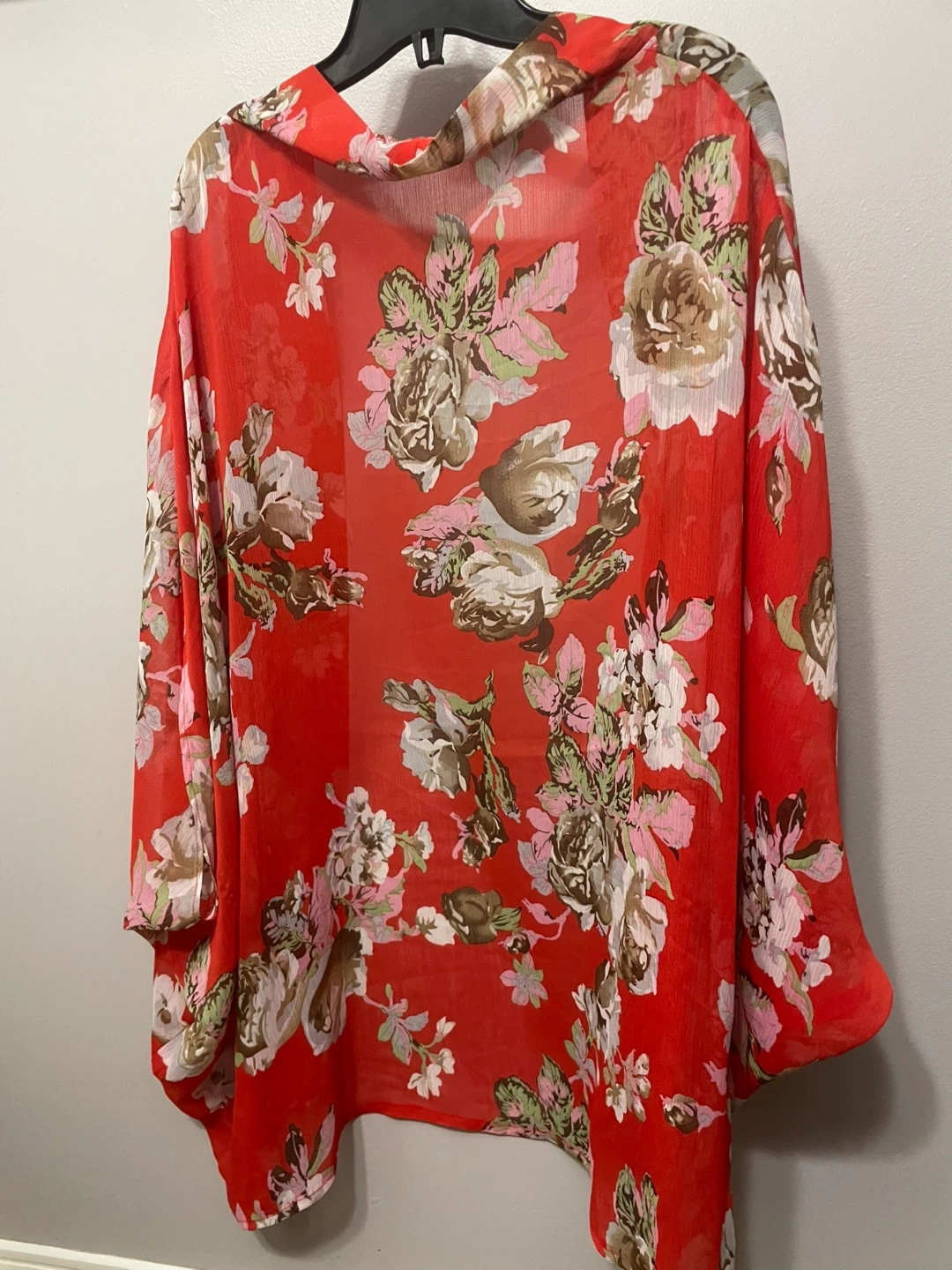 This is a lightweight kimono cardigan with a vibrant red floral print. It's made of sheer chiffon fabric and drapes open at the front. Its flowy design makes it a lovely layering piece.