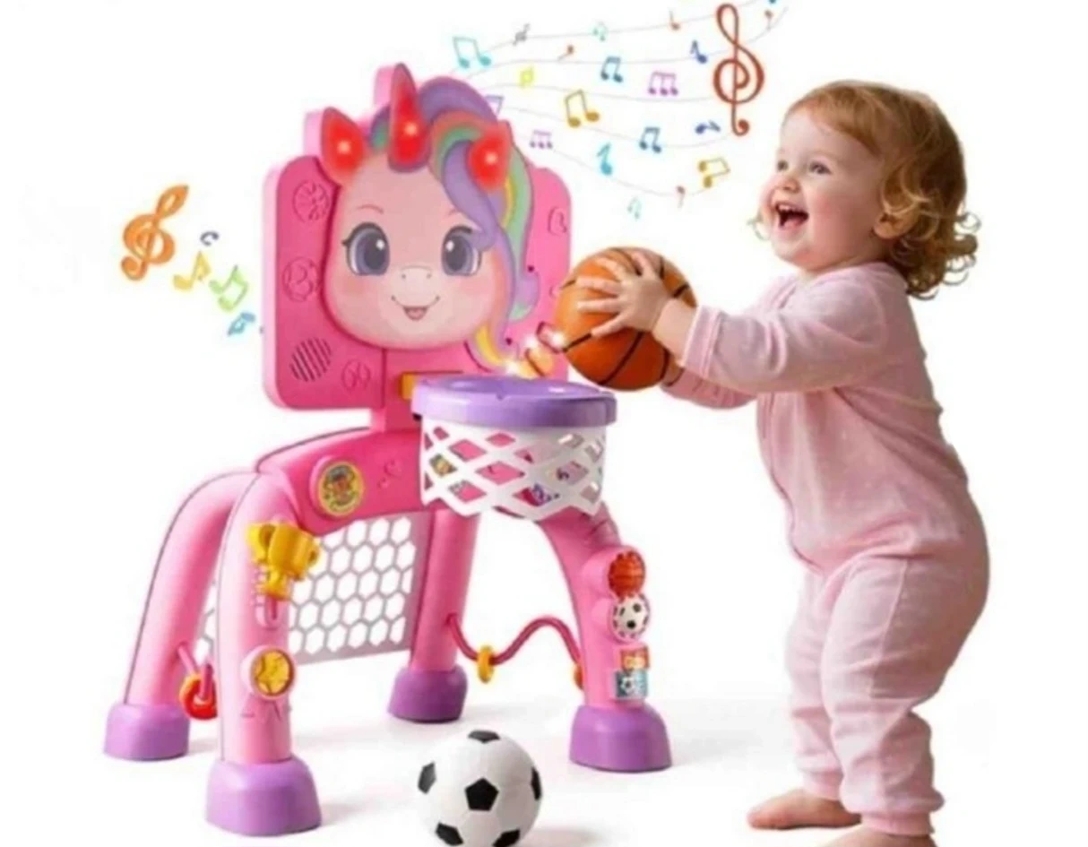 This pink unicorn activity center is designed for babies aged 12 months and up. It features a basketball hoop, soccer goal, and a learning clock. It also includes music and sounds, sliding rings, spin gears, a trophy slider, and a squeaky toy. It's a 2-in-1 learning and sports activity centre that helps grow motor skills, music and logic!