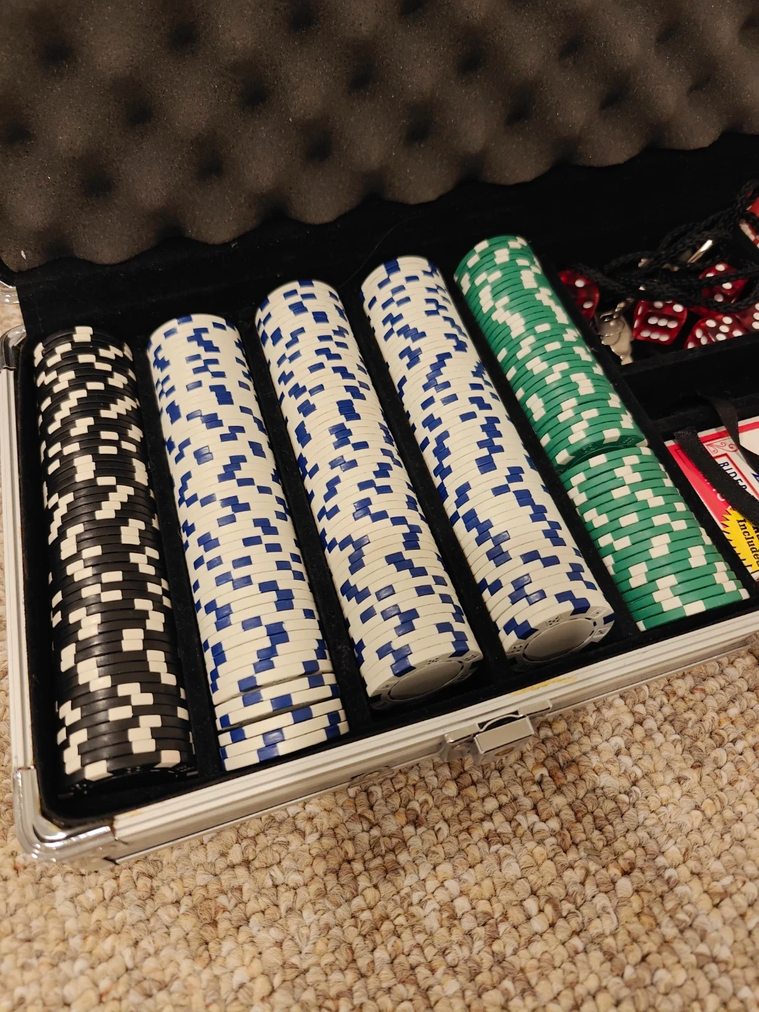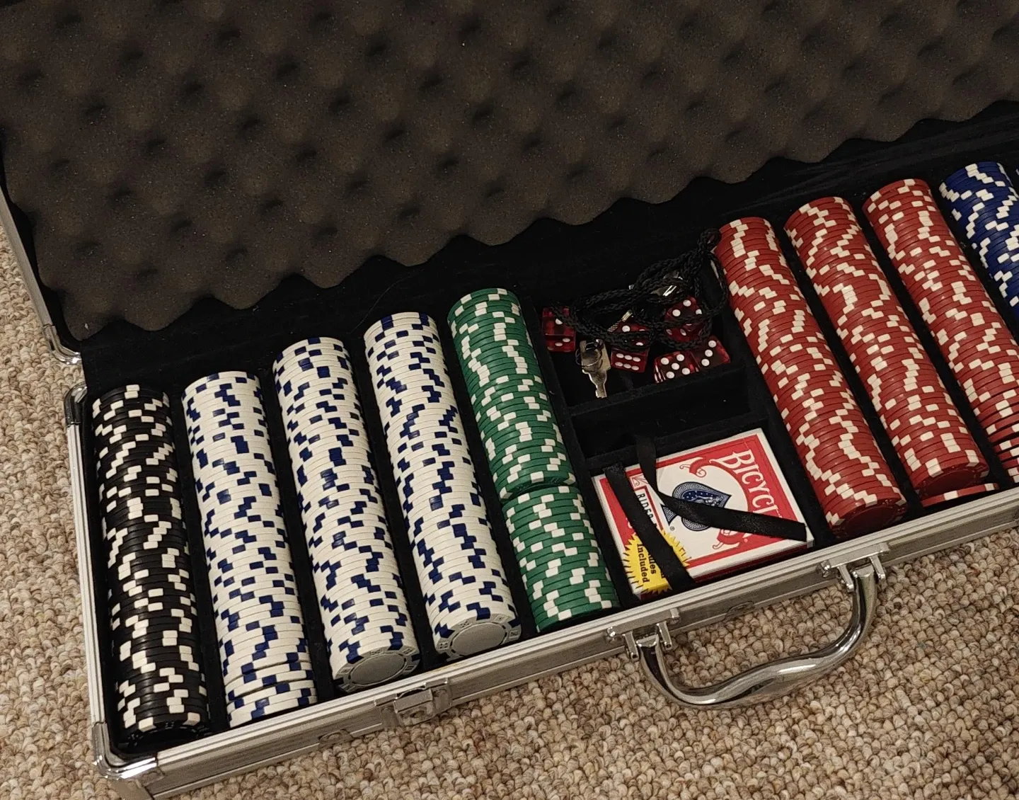 Complete poker chip set in a silver case. Includes stacks of chips in black, white, blue, green, and red. Also comes with a deck of Bicycle playing cards and dice. Perfect for game nights at home!