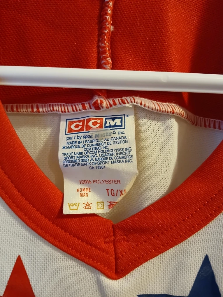This is a CCM Washington Capitals hockey jersey. It's made of 100% polyester and is size TG/XL. The jersey features the team's classic logo and star design. Has been well worn with love.